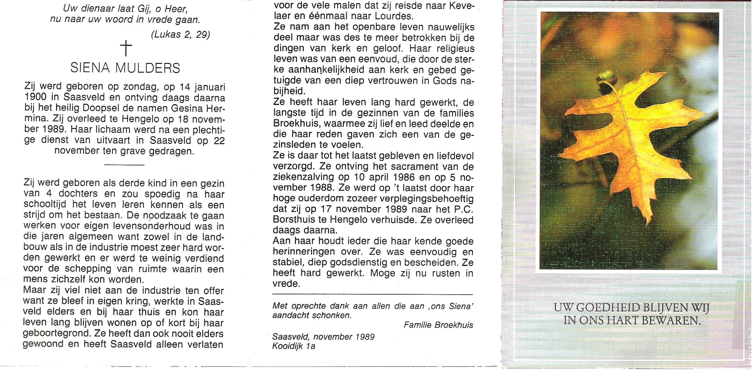 MULDERS, Siena (Gesina Hermina), geboren op 14-1-1900 te Saasveld, overleden op 18-11-1989 te Hengelo (Ov.) op 89-jarige leeftijd, begraven op 22-11-1989 te Saasveld.