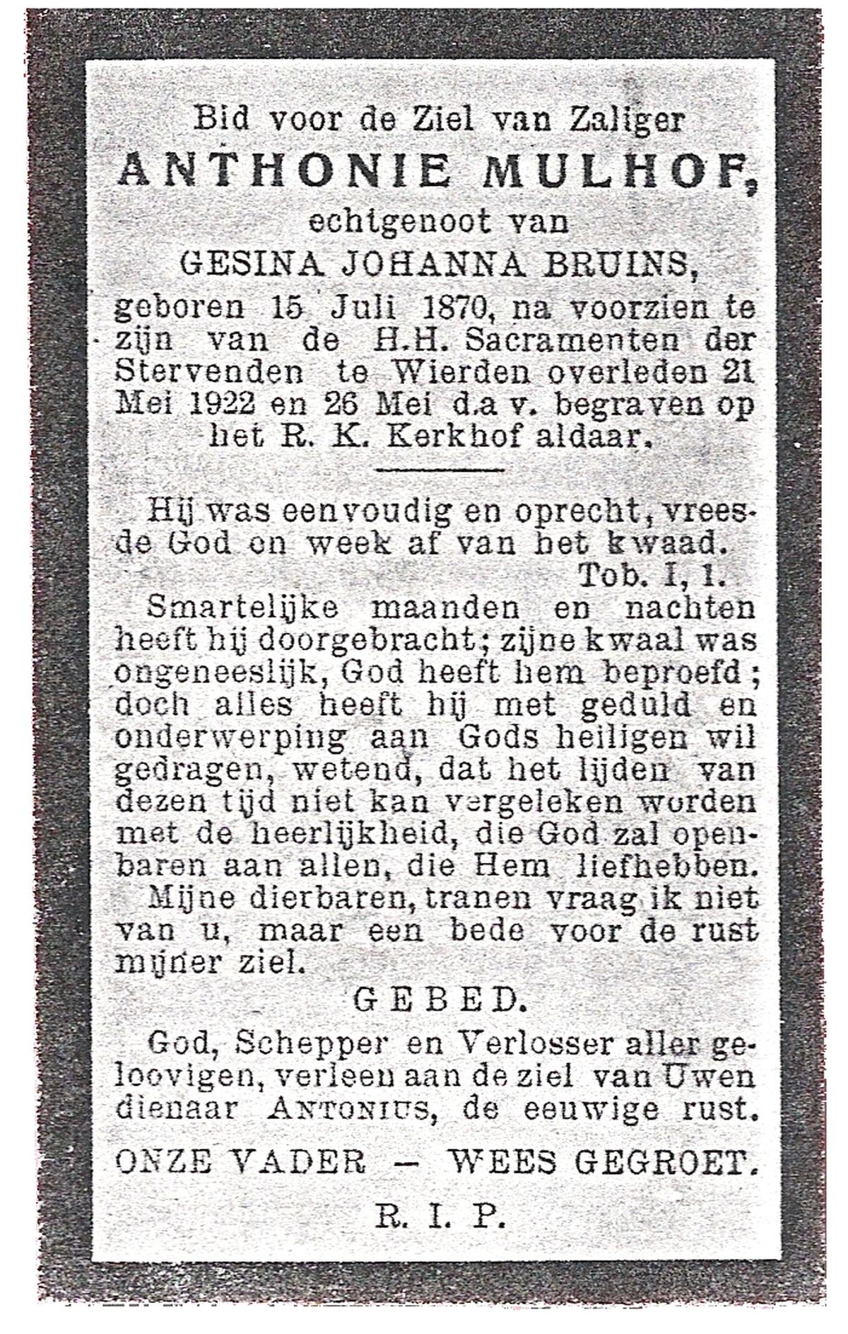 MULHOF, Anthonie, geboren op 15-07-1870, overleden op 21-5-1922 te Wierden op 51-jarige leeftijd, begraven op 26-5-1922 te Wierden.