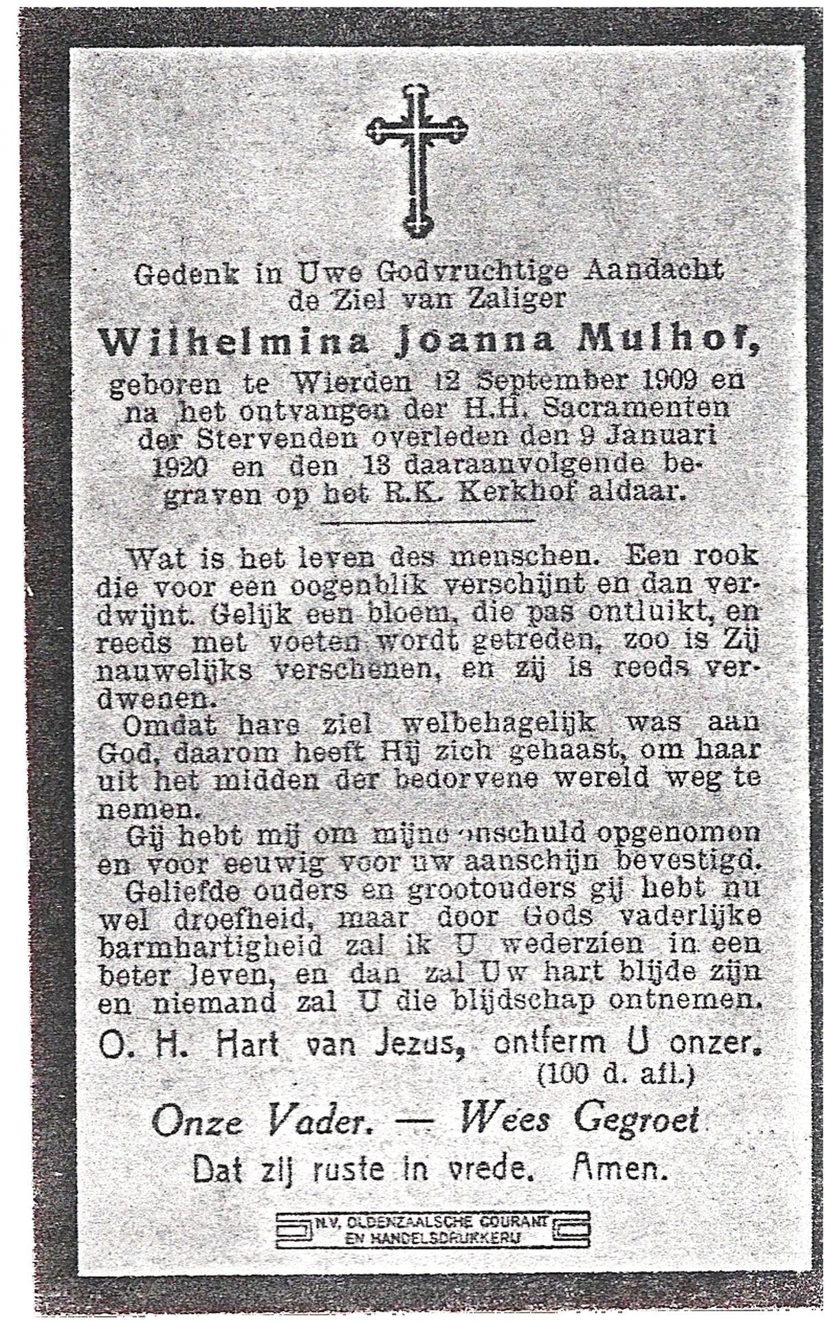 MULHOF, Wilhelmina Joanna, geboren op 12-9-1909 te Wierden, overleden op 9-1-1920 te Wierden op 10-jarige leeftijd, begraven op 13-1-1920 te Wierden.