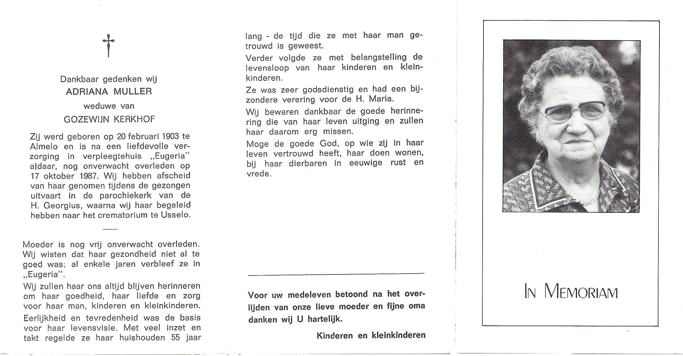 MULLER, Adriana, geboren op 20-2-1903 te Almelo, overleden op 17-10-1987 te Almelo op 84-jarige leeftijd, gecremeerd te Usselo.