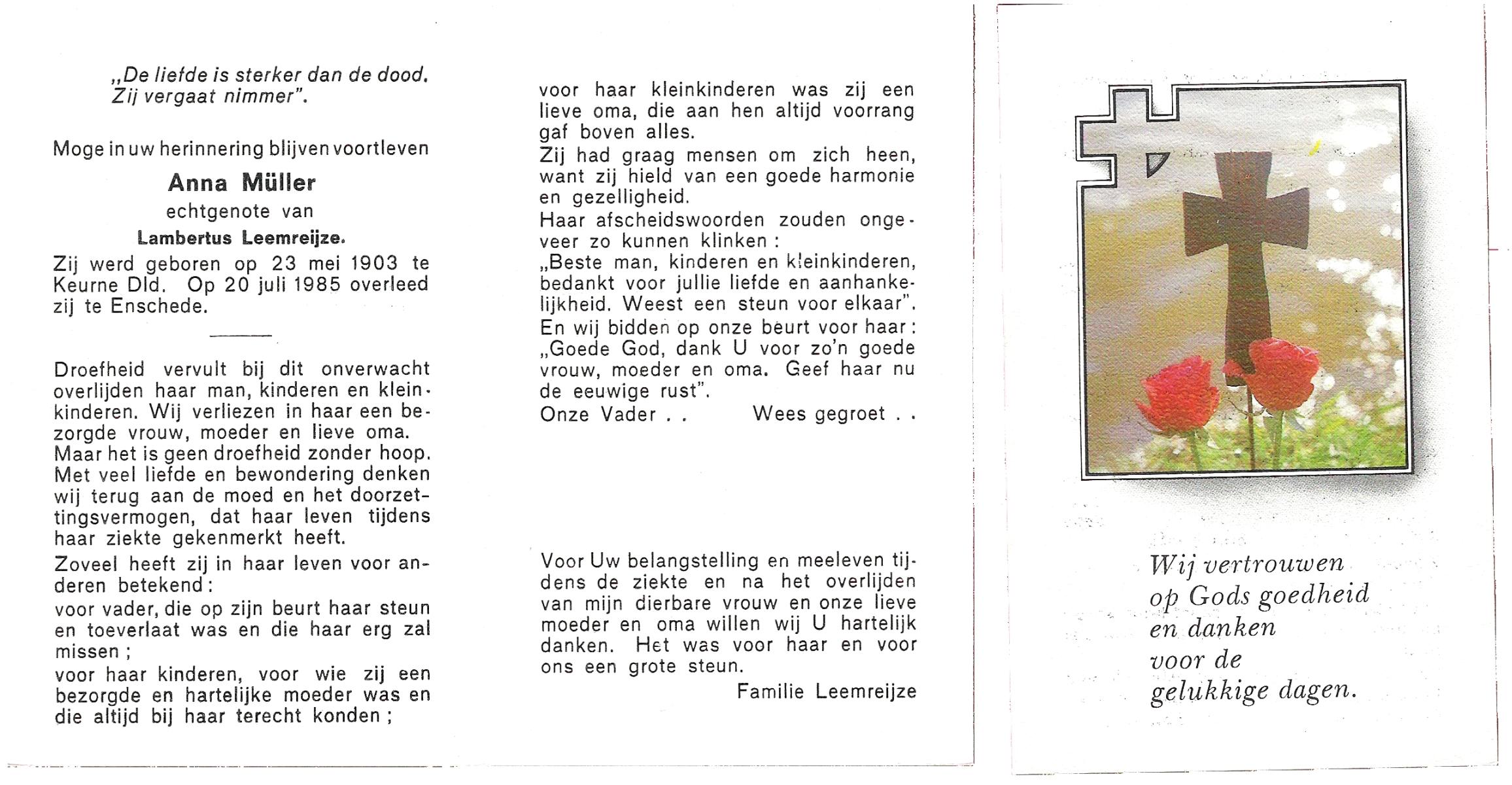 MÜLLER, Anna, geboren op 23-5-1903 te Keurne (Duitsland), overleden op 20-7-1985 te Enschede op 82-jarige leeftijd.