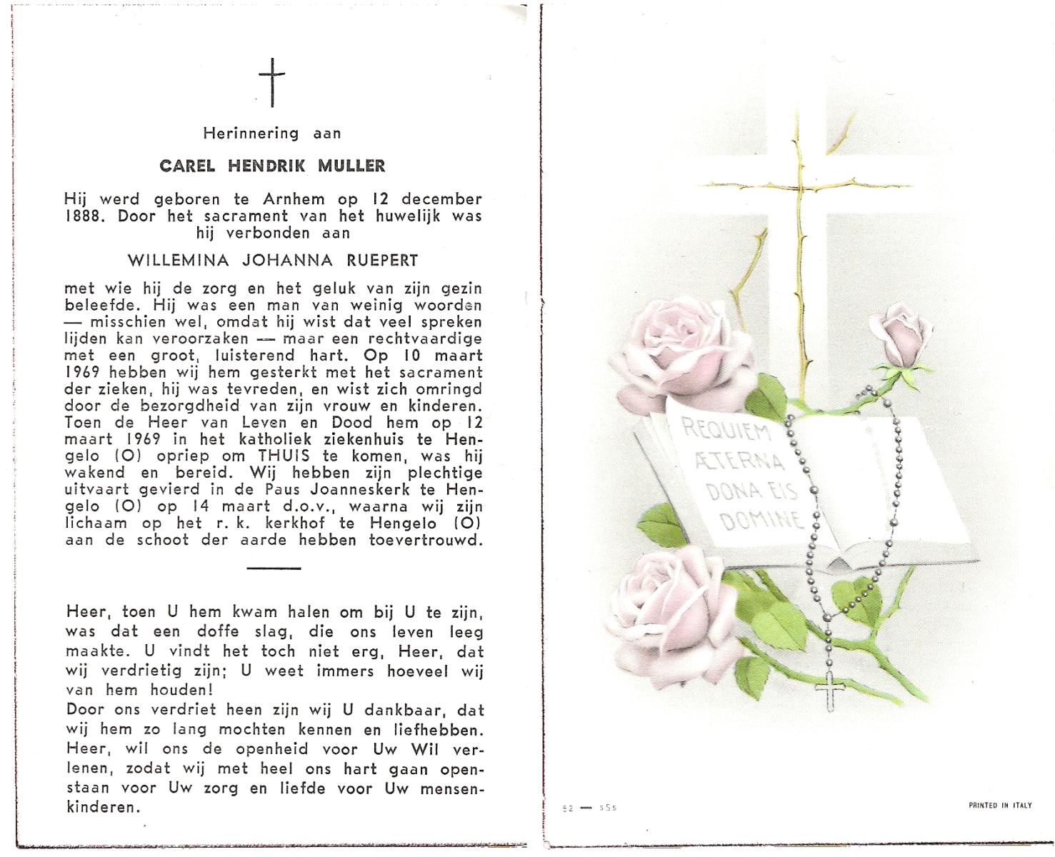 MULLER, Carel Hendrik, geboren op 12-12-1888 te Arnhem, overleden op 12-3-1969 te Hengelo (Ov.) op 80-jarige leeftijd, begraven op 14-3-1969 te Hengelo (Ov.).