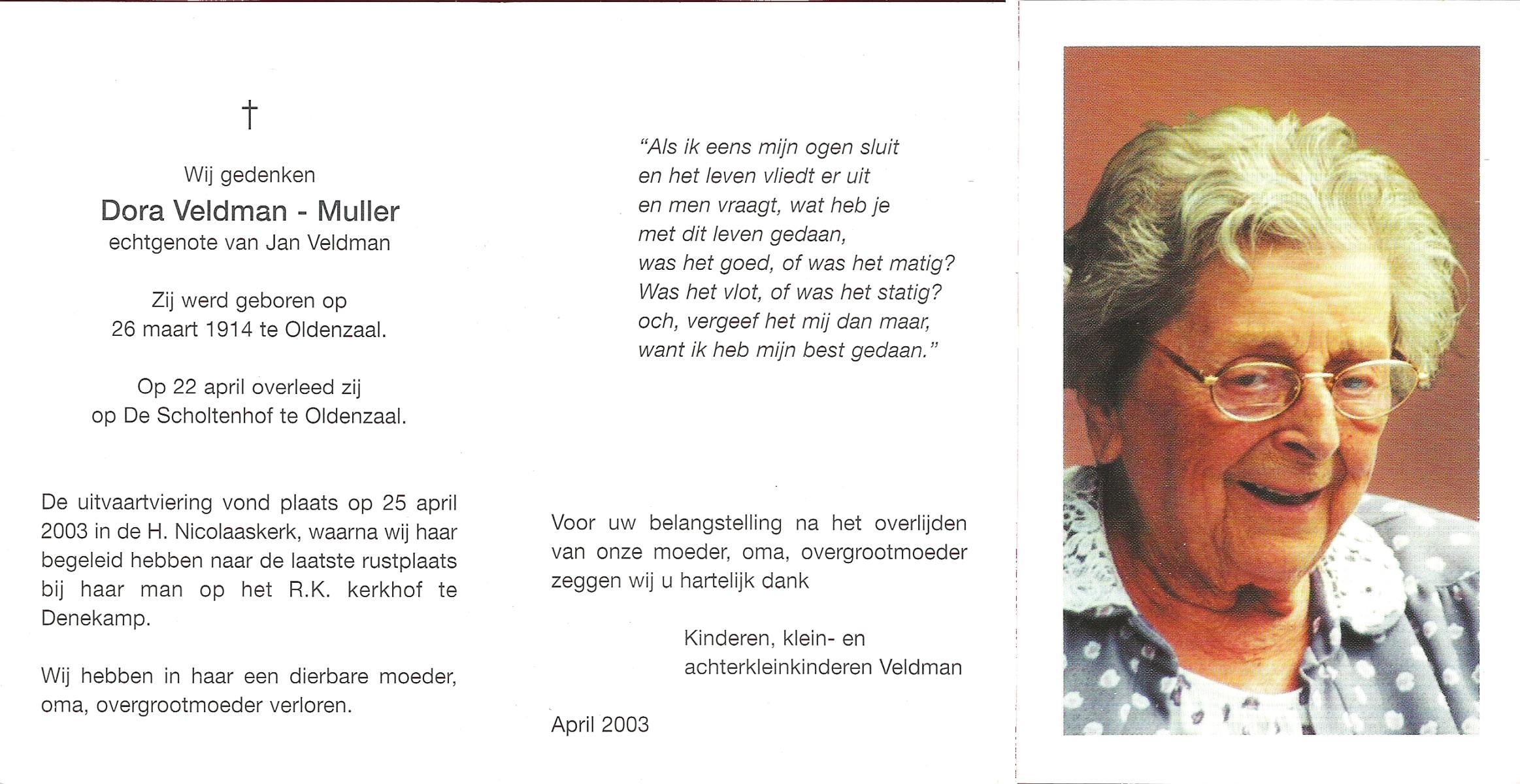 MULLER, Dora, geboren op 26-4-1914 te Oldenzaal, overleden op 22-4-2003 te Oldenzaal op 88-jarige leeftijd, begraven op 25-4-2003 te Denekamp.