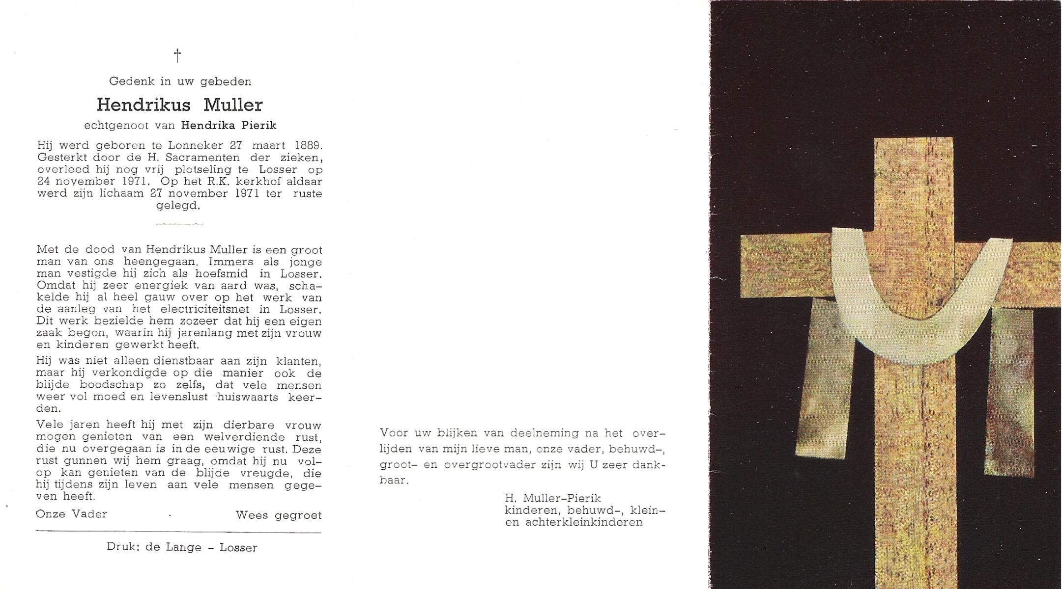 MULLER, Hendrikus, geboren op 27-03-1889 te Lonneker, overleden op 24-11-1971 te Losser op 82-jarige leeftijd, begraven op 27-11-1971 te Losser.