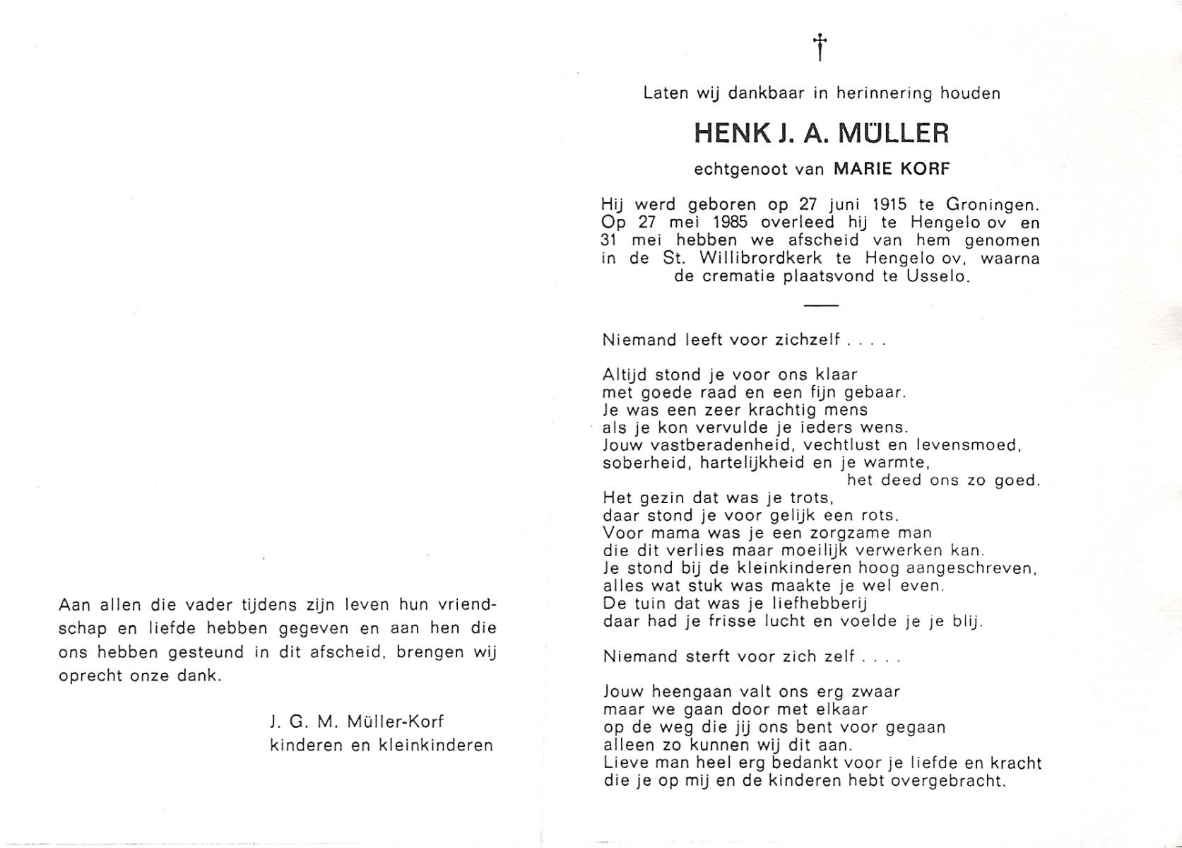 MÜLLER, Henk J.A., geboren op 27-6-1915 te Groningen, overleden op 27-5-1985 te Hengelo (Ov.) op 69-jarige leeftijd, gecremeerd op 31-5-1985 te Usselo.