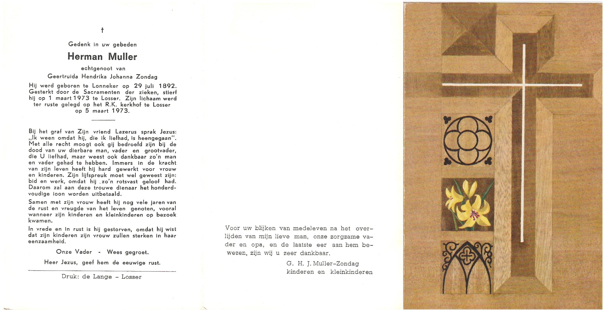 MULLER, Herman, geboren op 29-07-1892 te Lonneker, overleden op 1-3-1973 te Losser op 80-jarige leeftijd, begraven op 5-3-1973 te Losser.
