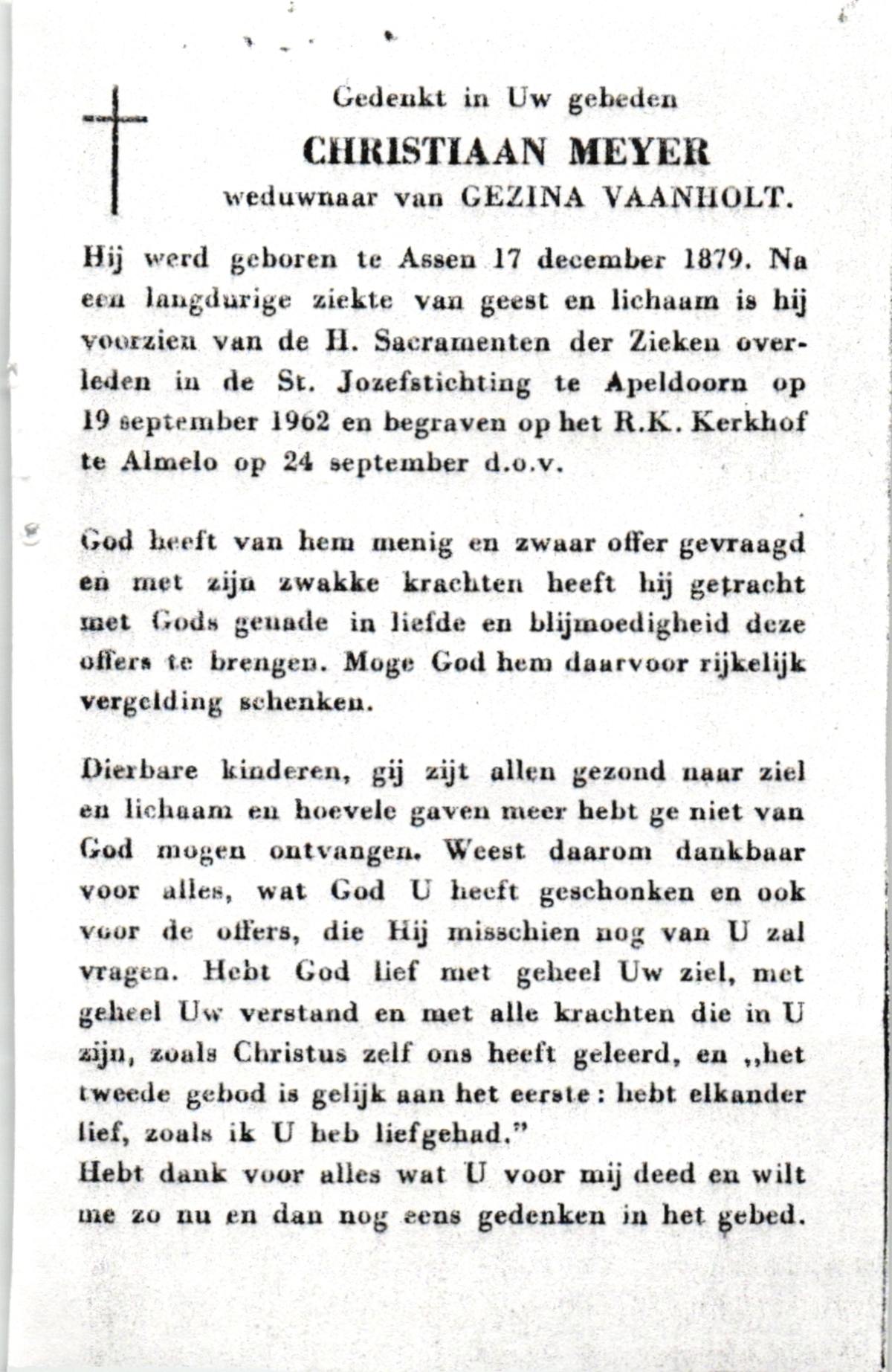 MEYER, , Christiaan, geboren op 17-12-1879 te Assen, overleden op 19-9-1962 te Apeldoorn op 82-jarige leeftijd, begraven op 24-9-1962 te Almelo.