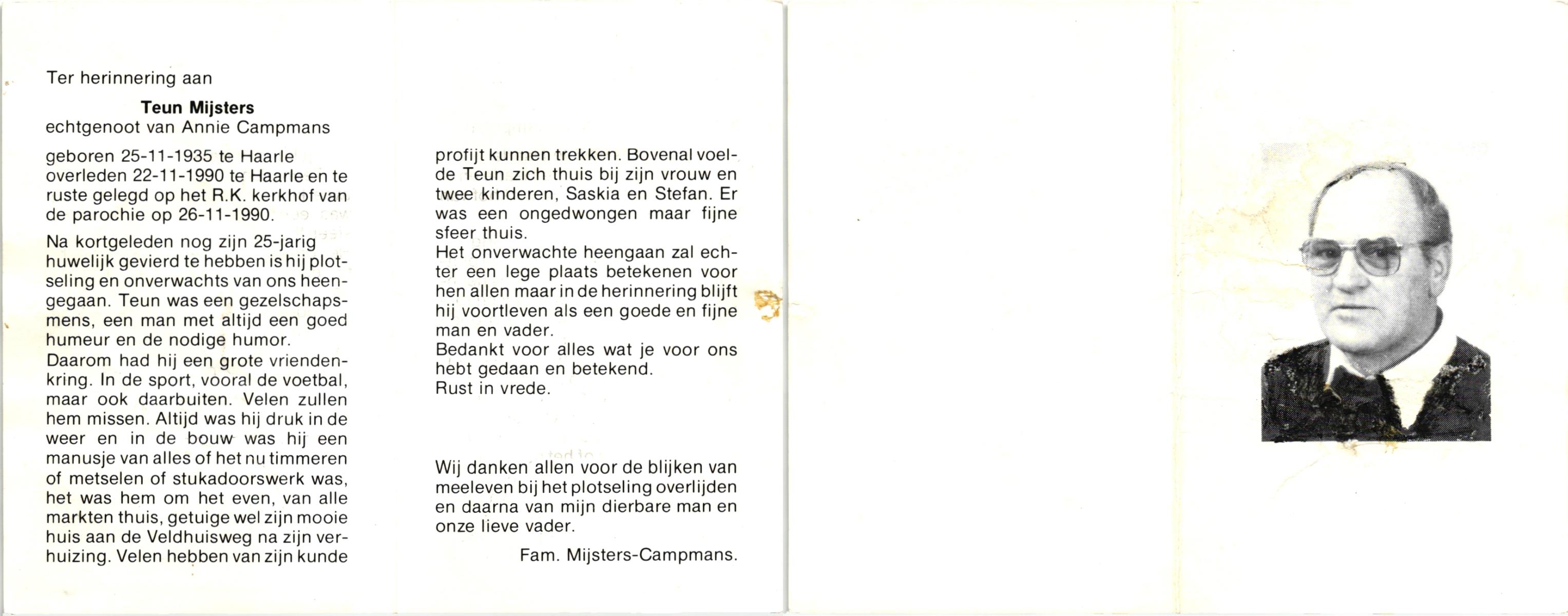 MIJSTERS, , Teun, geboren op 25-11-1935 te Hellendoorn, Haarle, overleden op 22-11-1990 te Hellendoorn, Haarle op 54-jarige leeftijd, begraven op 26-11-1990 te Hellendoorn, Haarle.