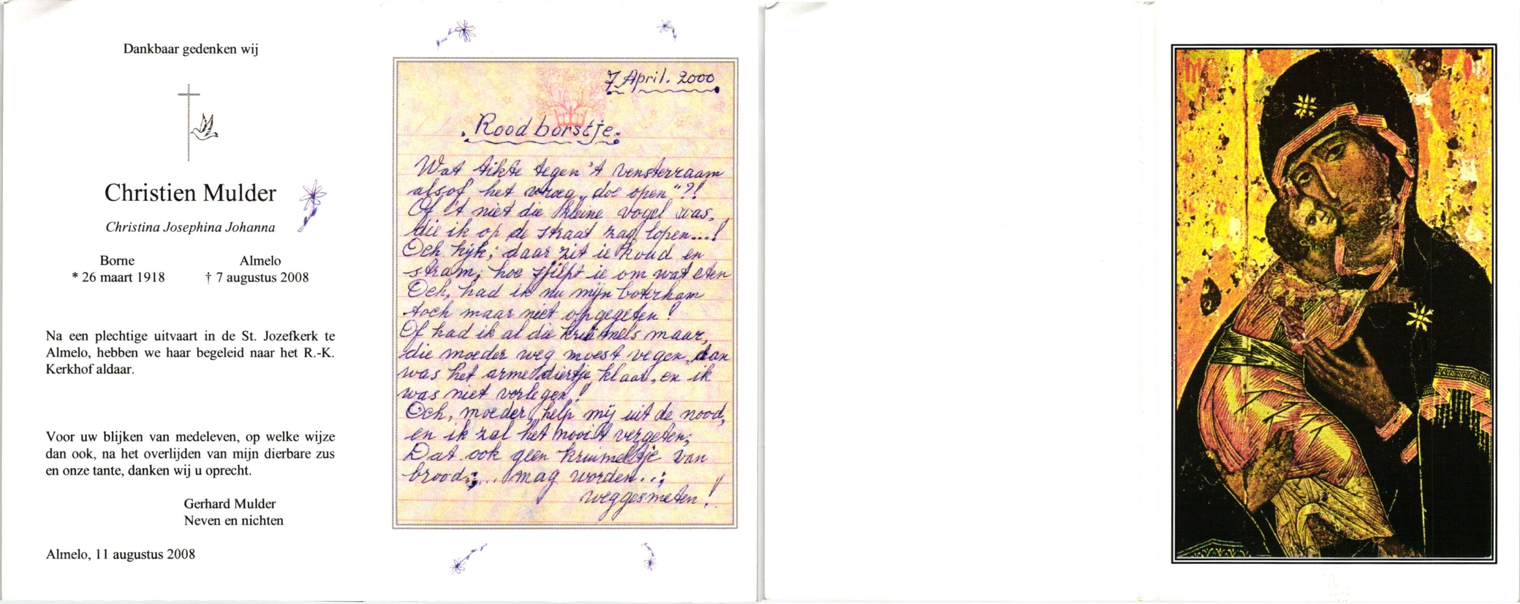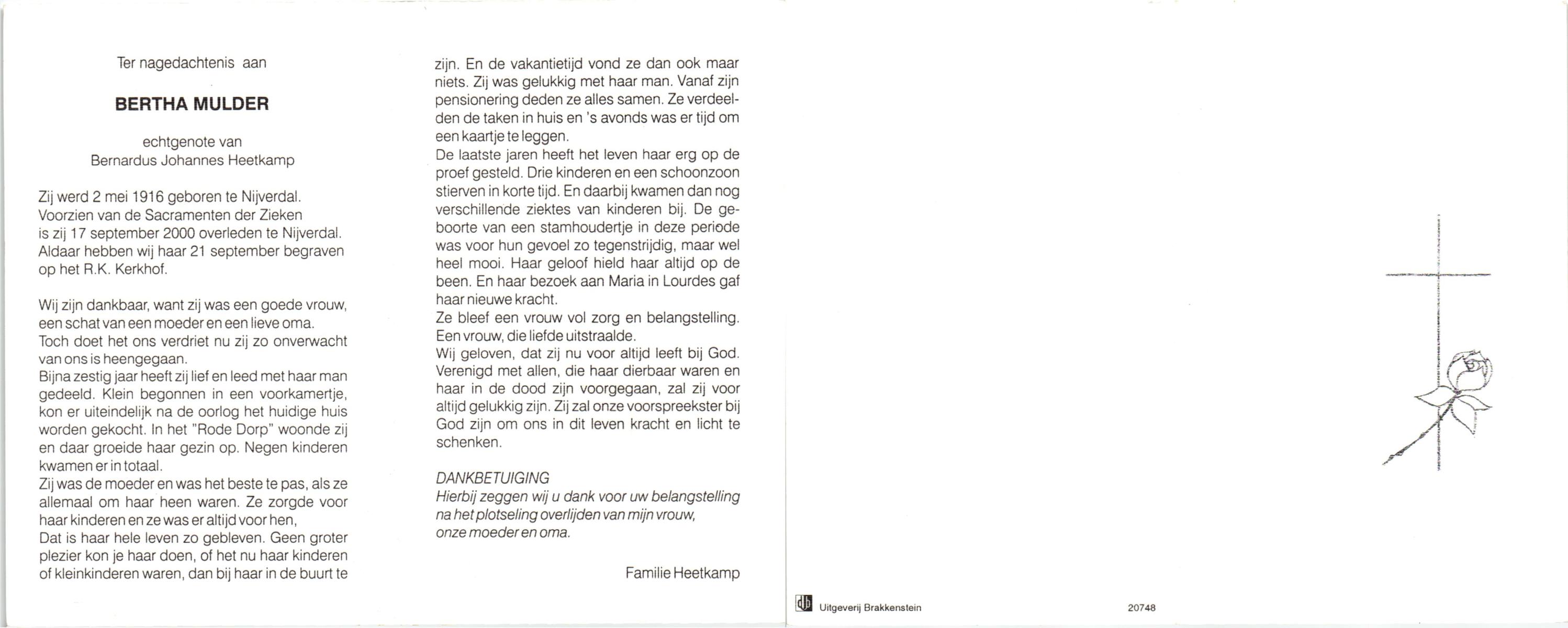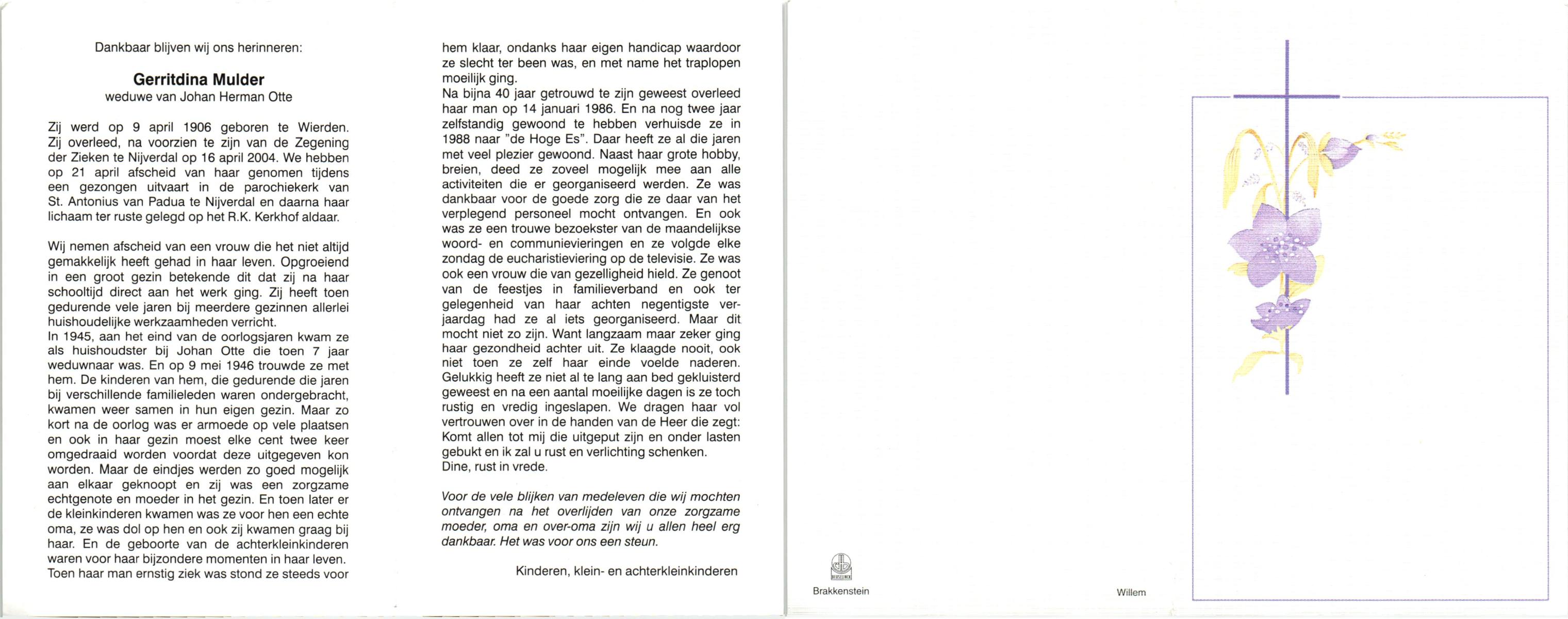 MULDER, , Maria, geboren op 12-9-1921 te Hellendoorn, Nijverdal, overleden op 14-2-2004 te Hellendoorn, Blenke op 82-jarige leeftijd, gecremeerd op 20-2-2004 te Almelo.