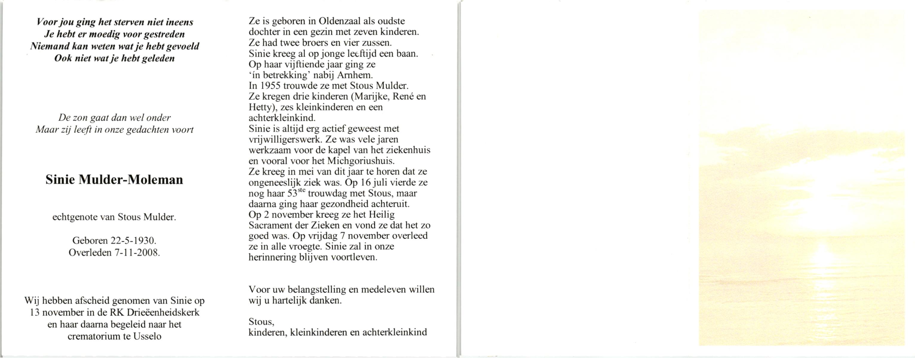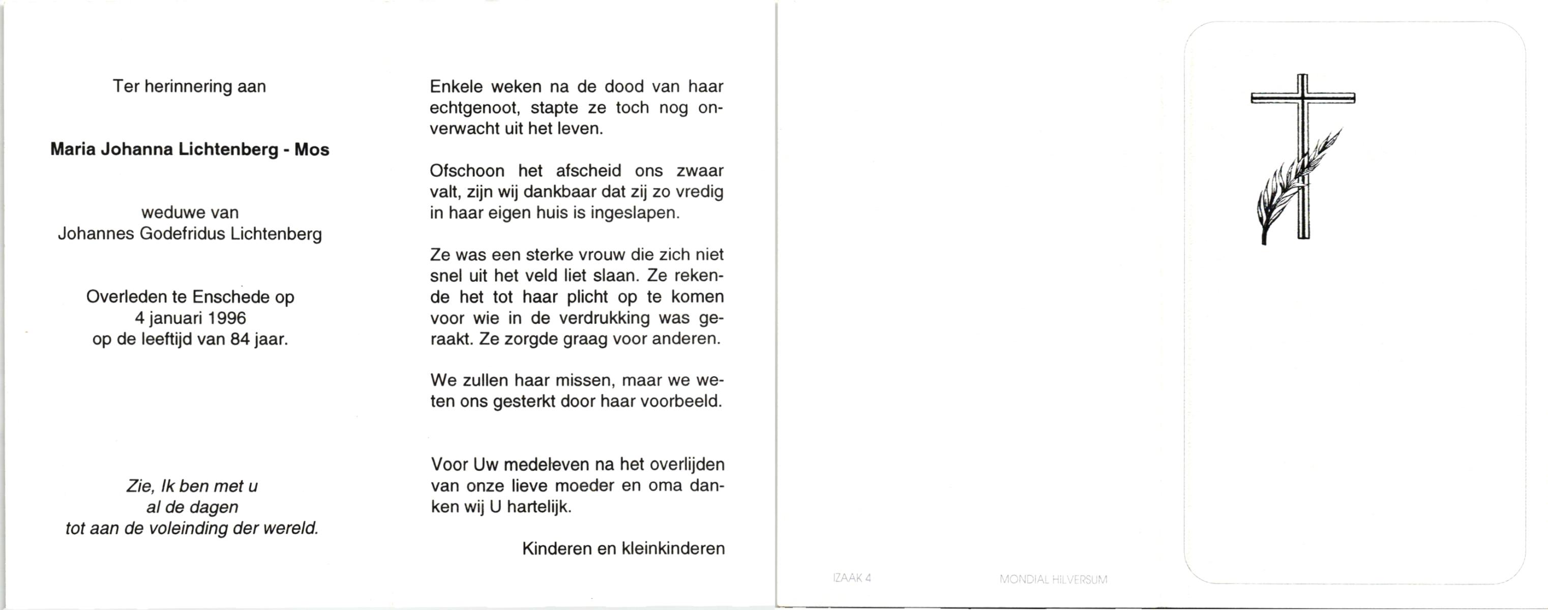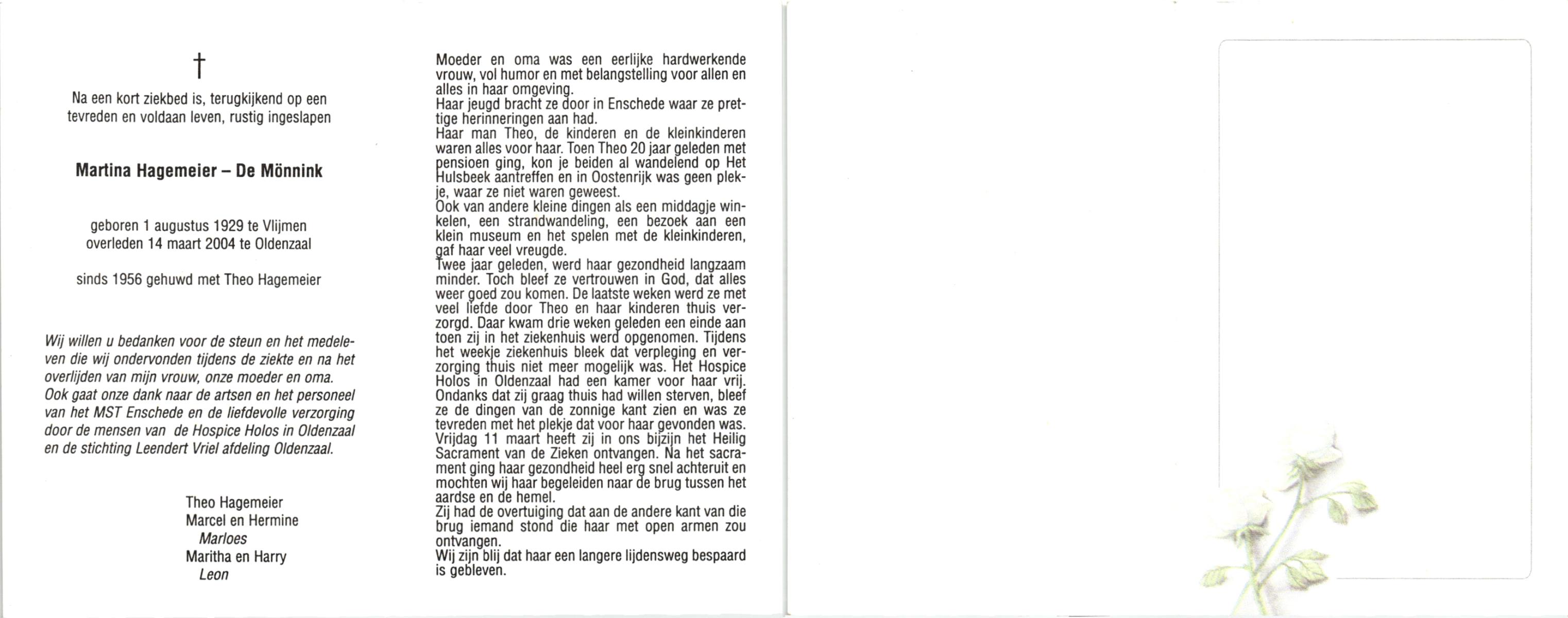 MULDER, , Maria, geboren op 12-9-1921 te Hellendoorn, Nijverdal, overleden op 14-2-2004 te Hellendoorn, Blenke op 82-jarige leeftijd, gecremeerd op 20-2-2004 te Almelo.