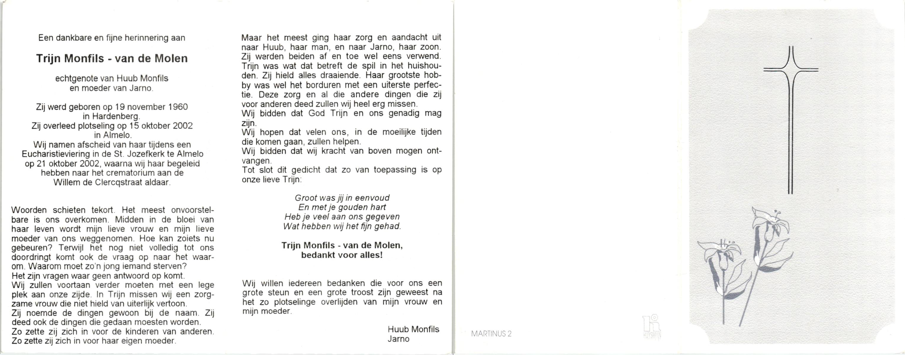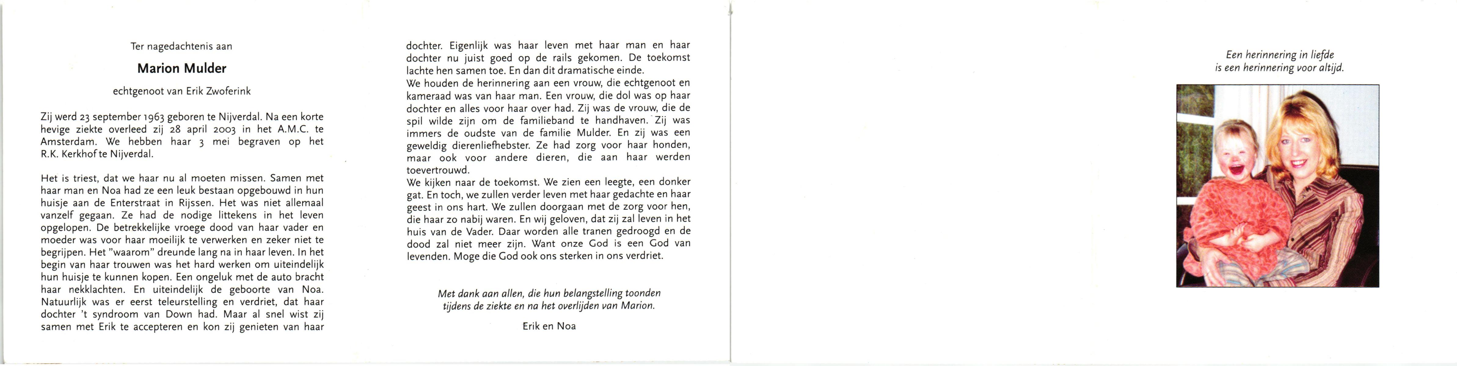 MULDER, Marion, geboren op 23-9-1963 te Hellendoorn, Nijverdal, overleden op 28-4-2003 te Amsterdam op 39-jarige leeftijd, begraven op 3-5-2003 te Hellendoorn, Nijverdal, rk.