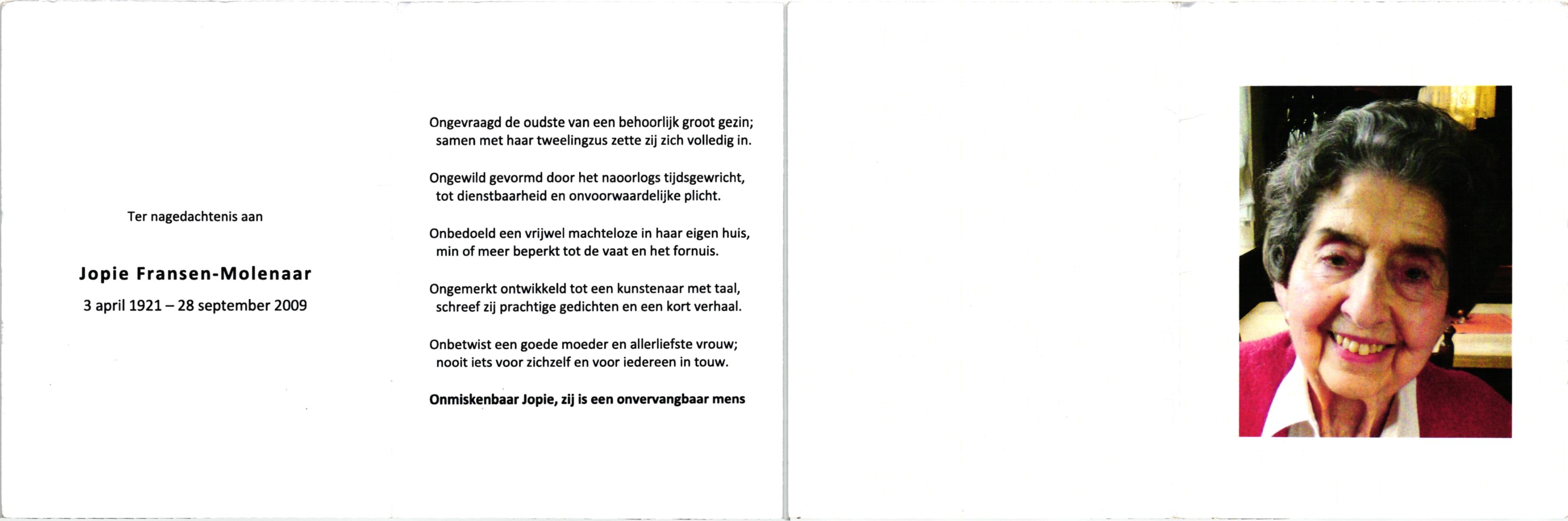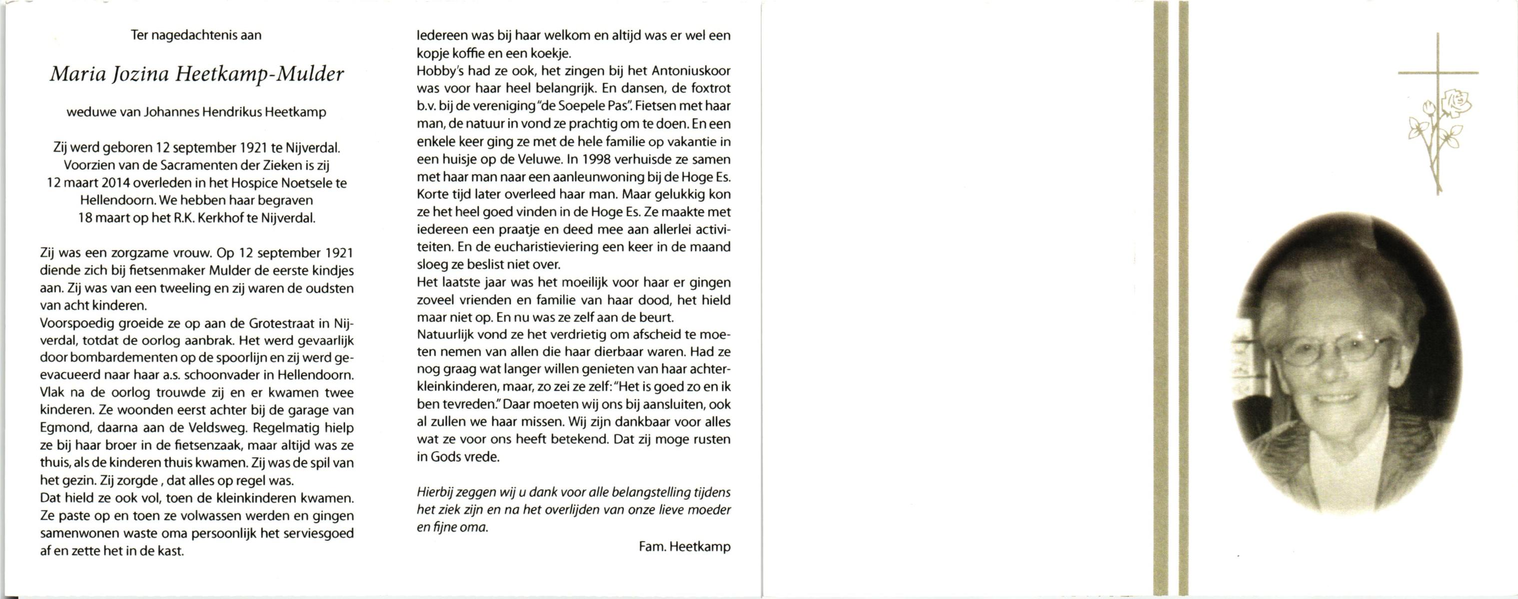 MULDER, Maria Jozina, geboren op 12-9-1921 te Hellendoorn, Nijverdal, overleden op 12-3-2014 te Hellendoorn op 92-jarige leeftijd, begraven op 18-3-2014 te Hellendoorn, Nijverdal, rk.