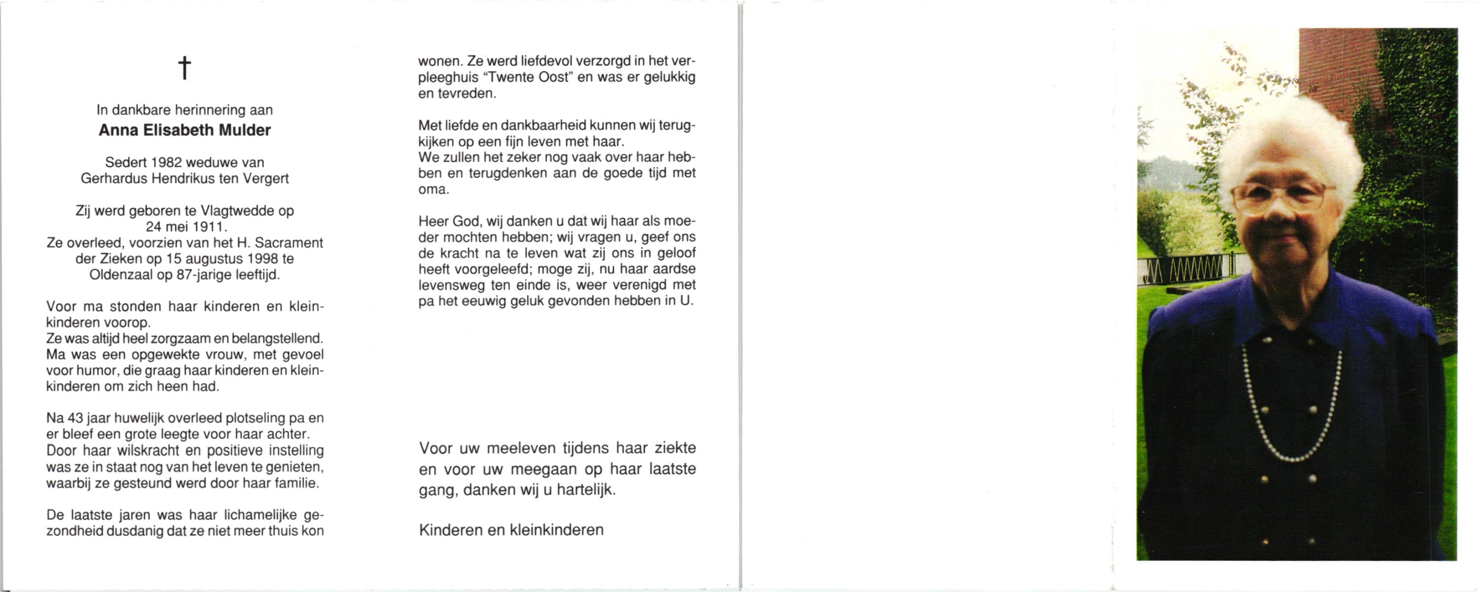 MULDER, , Anna Elisabeth, geboren op 24-5-1911 te Vlagtwedde, overleden op 15-8-1998 te Oldenzaal op 87-jarige leeftijd.