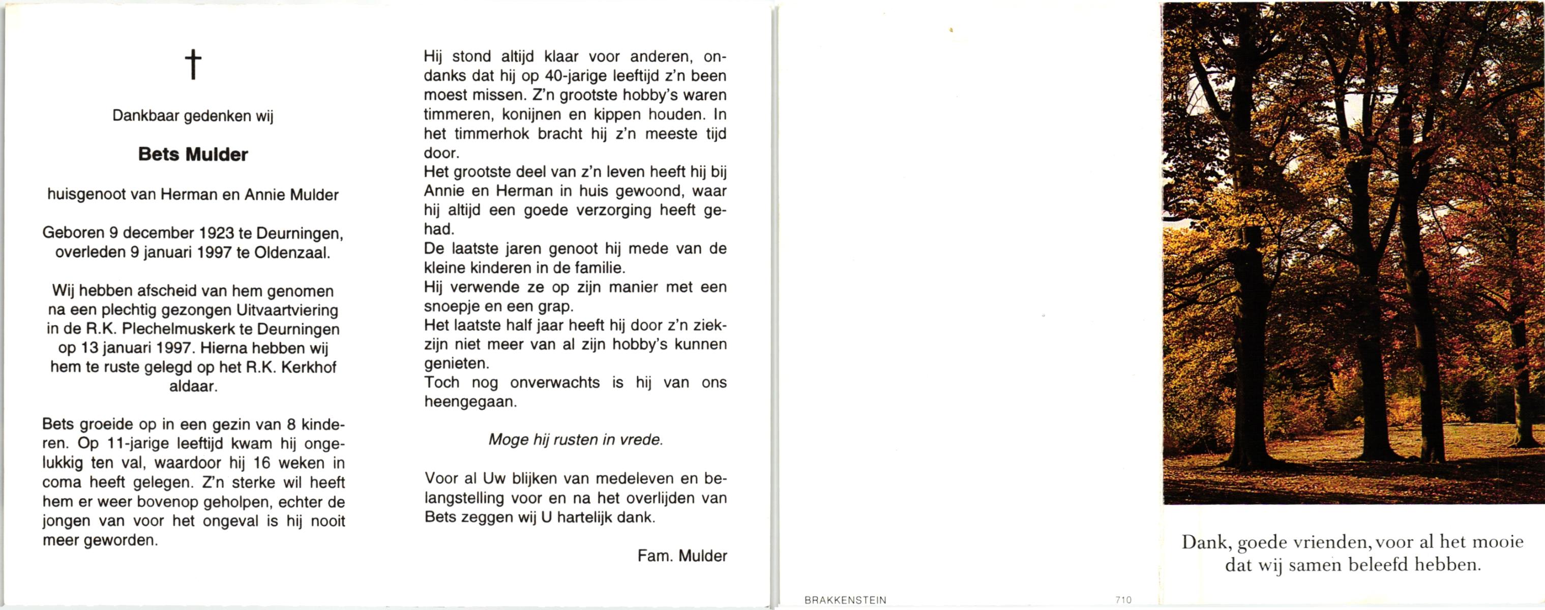 MULDER, , Bets, geboren op 9-12-1923 te Deurningen, overleden op 9-1-1997 te Oldenzaal op 73-jarige leeftijd, begraven op 13-1-1997 te Deurningen.