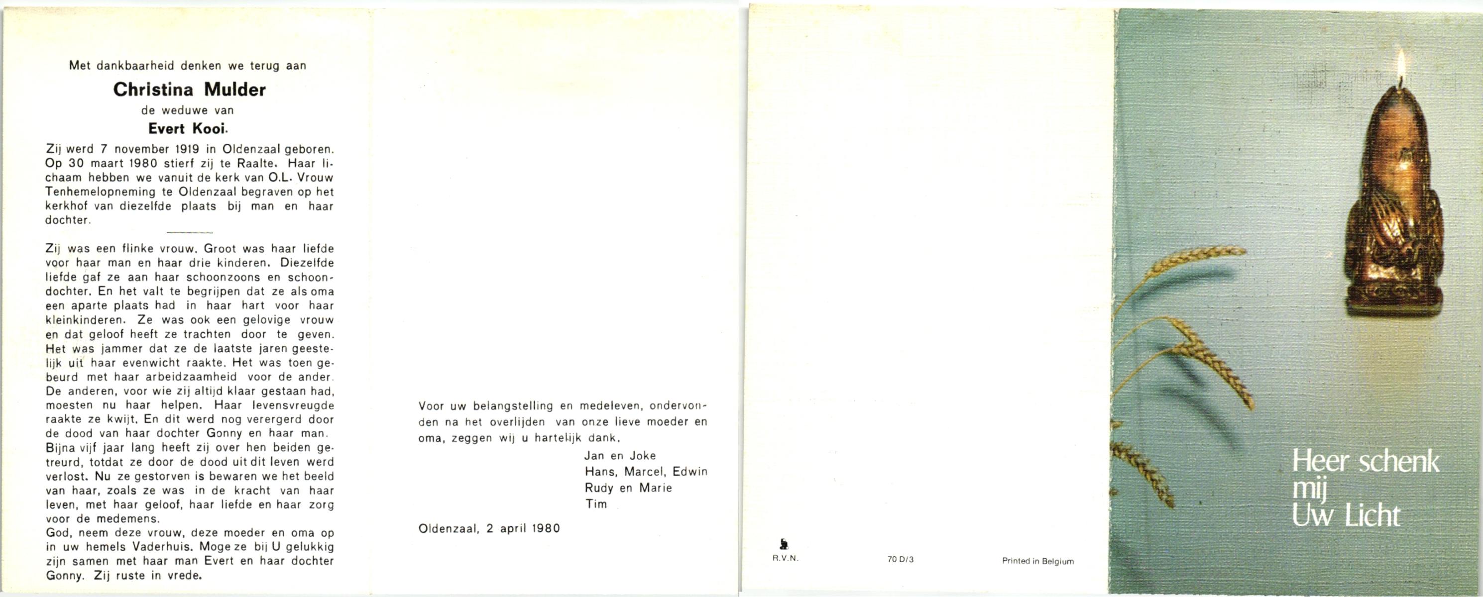 MULDER, , Christina, geboren op 7-11-1919 te Oldenzaal, overleden op 30-3-1980 te Raalte op 60-jarige leeftijd, begraven te Oldenzaal.