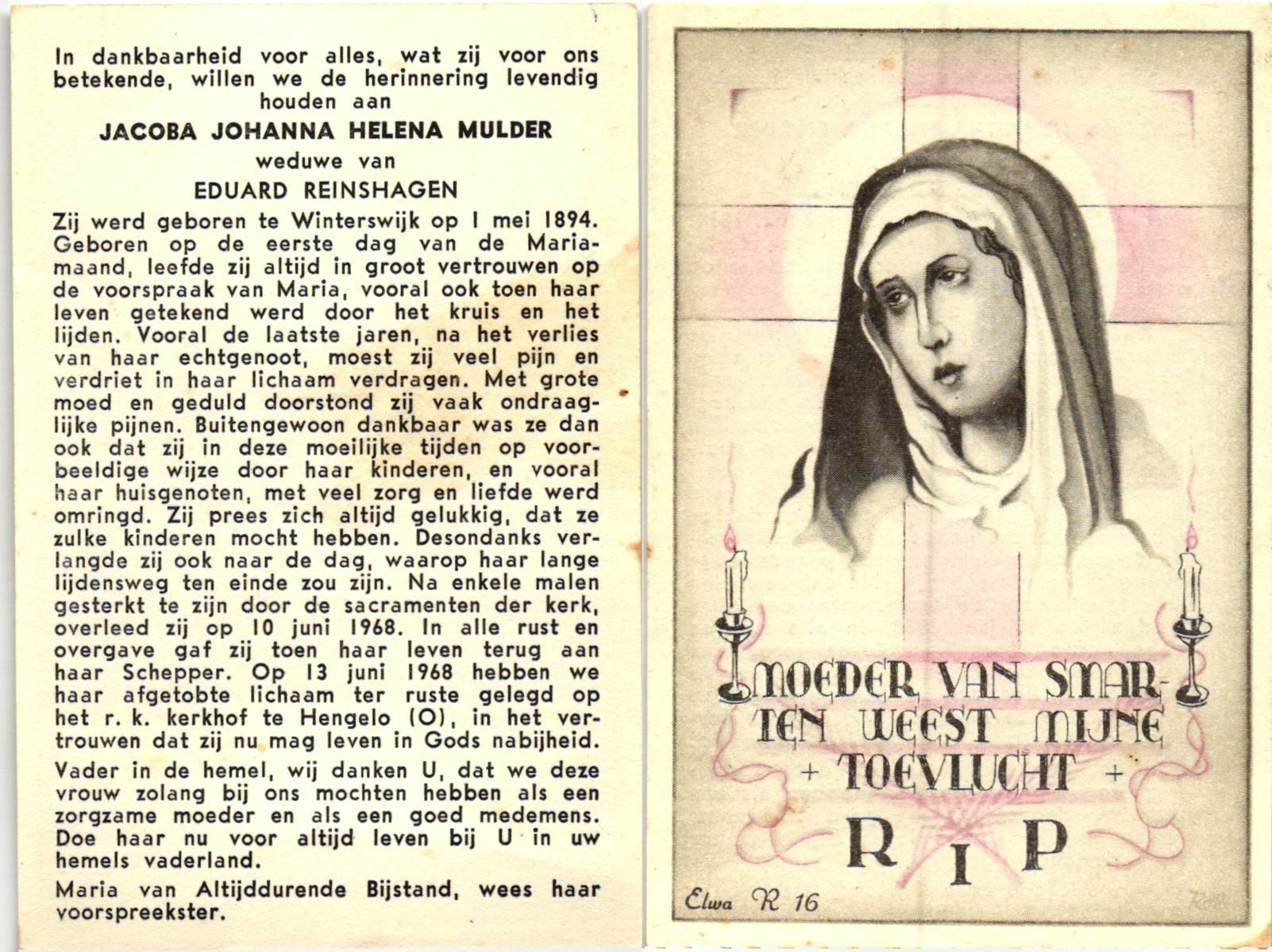 MULDER, , Jacoba Johanna Helena, geboren op 01-05-1894 te Winterswijk, overleden op 10-6-1968 op 74-jarige leeftijd, begraven op 13-6-1968 te Hengelo.