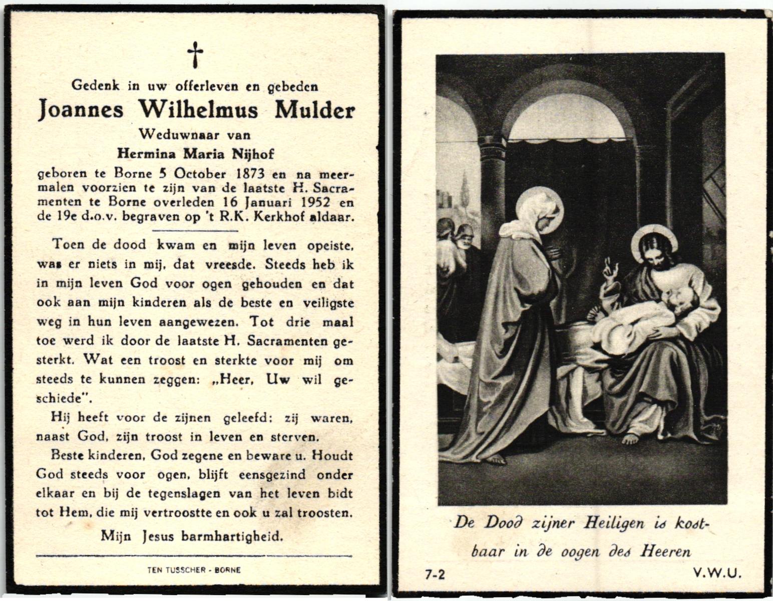 MULDER, , Joannes Wilhelmus, geboren op 05-10-1873 te Borne, overleden op 16-1-1952 te Borne op 78-jarige leeftijd, begraven op 19-1-1952 te Borne.