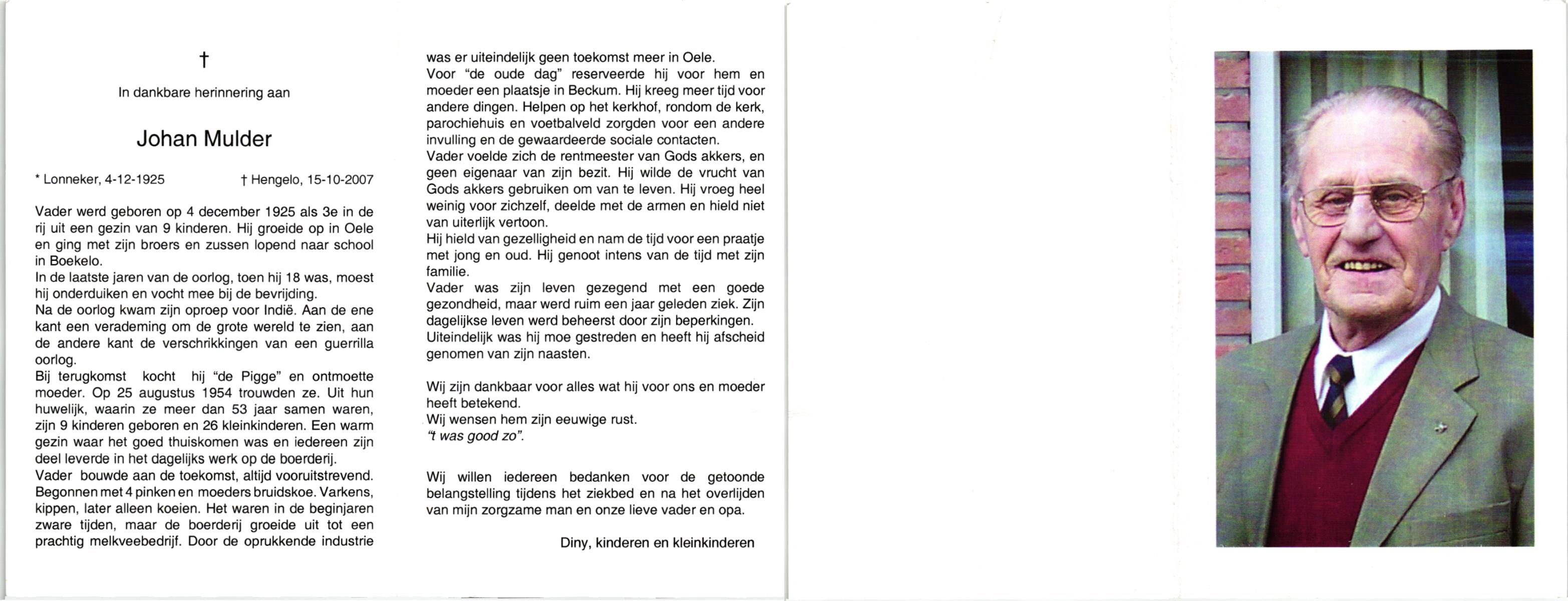 MULDER, , Johan, geboren op 4-12-1925 te Lonneker, overleden op 15-10-2007 te Hengelo (O) op 81-jarige leeftijd.