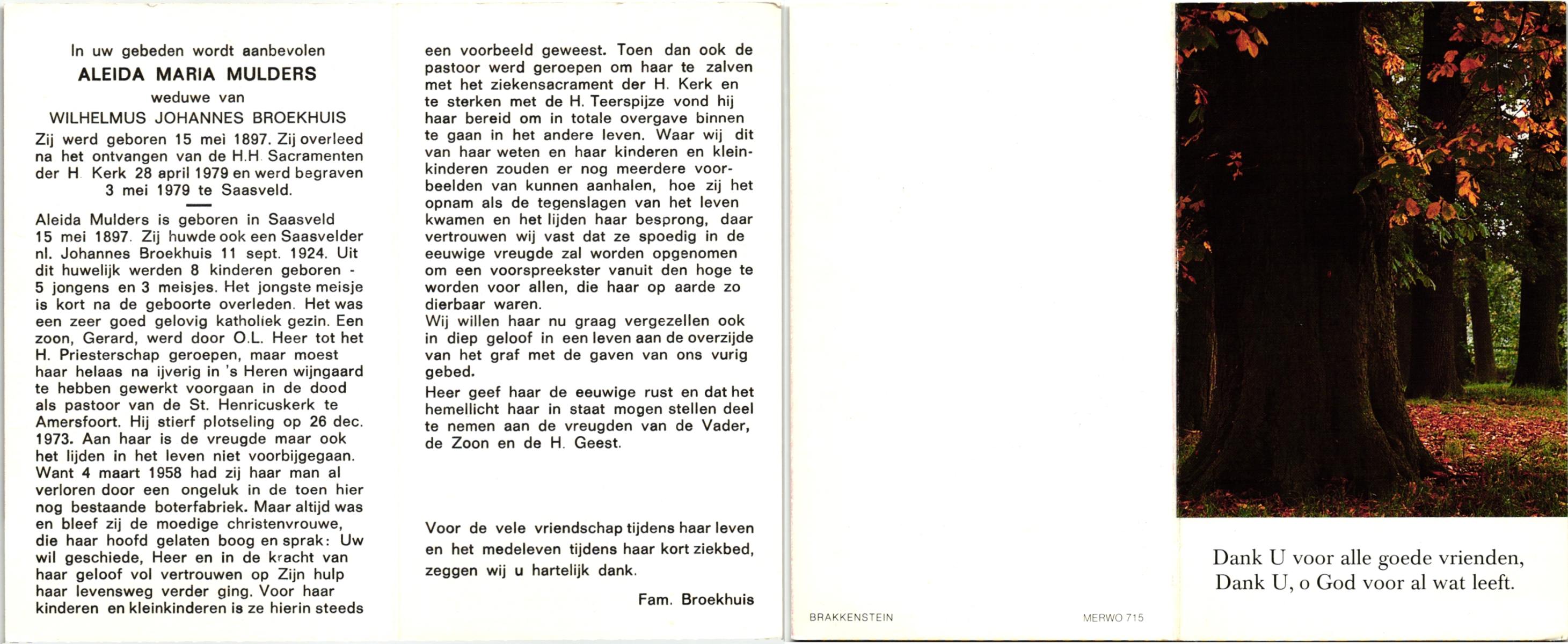 MULDERS, , Aleida Maria, geboren op 15-05-1897 te Saasveld, overleden op 28-4-1979 op 81-jarige leeftijd, begraven op 3-5-1979 te Saasveld.