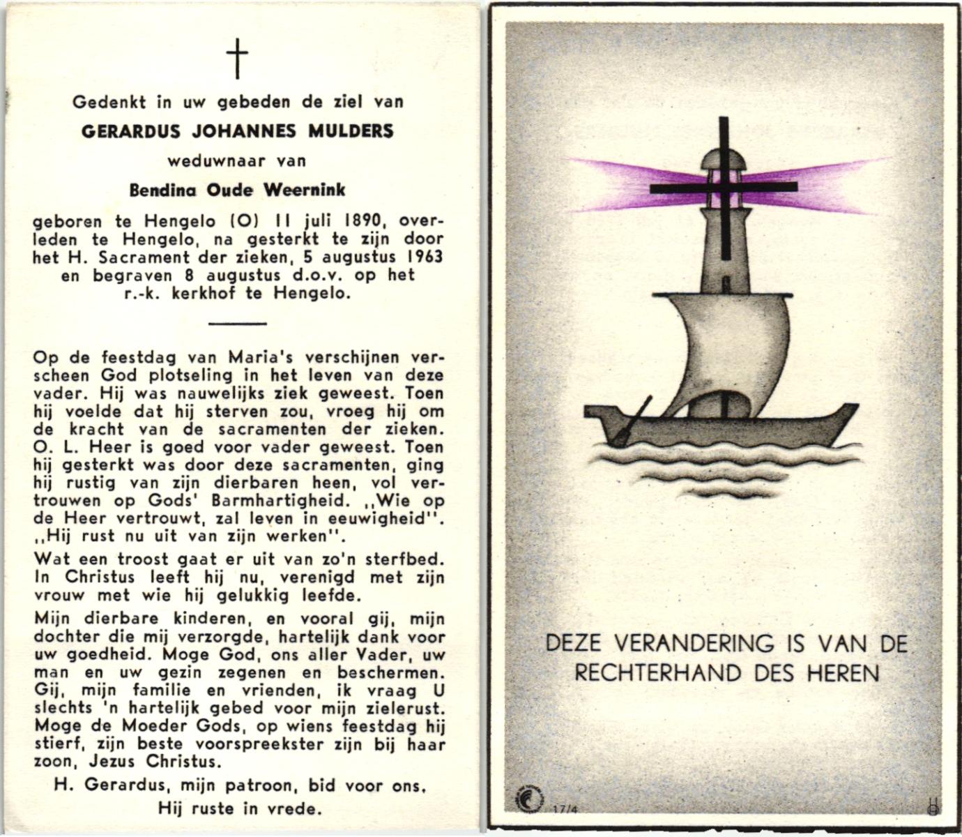 MULDERS, , Gerardus Johannes, geboren op 11-07-1890 te Hengelo (O), overleden op 5-8-1963 te Hengelo (O) op 73-jarige leeftijd, begraven op 8-8-1963 te Hengelo.