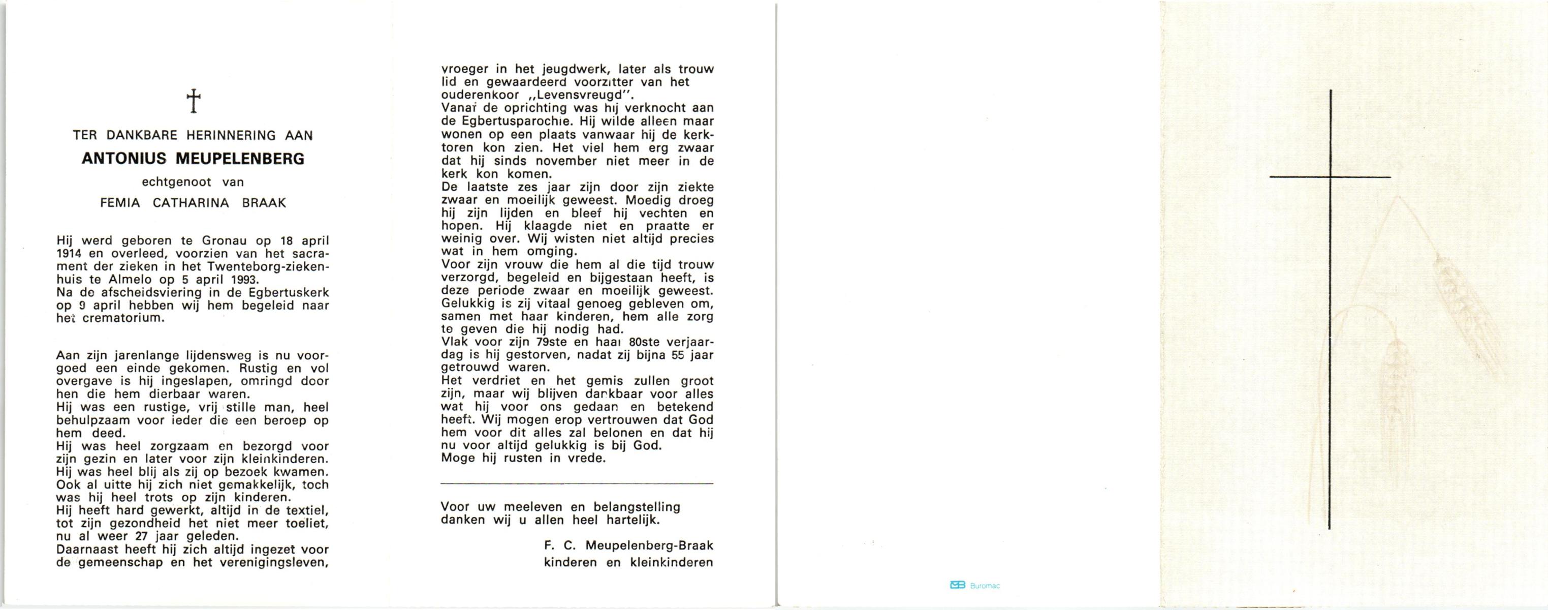 MEUPELENBERG, Antonius, geboren op 18-4-1914 te Gronau, Dld, overleden op 5-4-1993 te Almelo, ziekenhuis op 78-jarige leeftijd, gecremeerd op 8-4-1993 te Almelo.