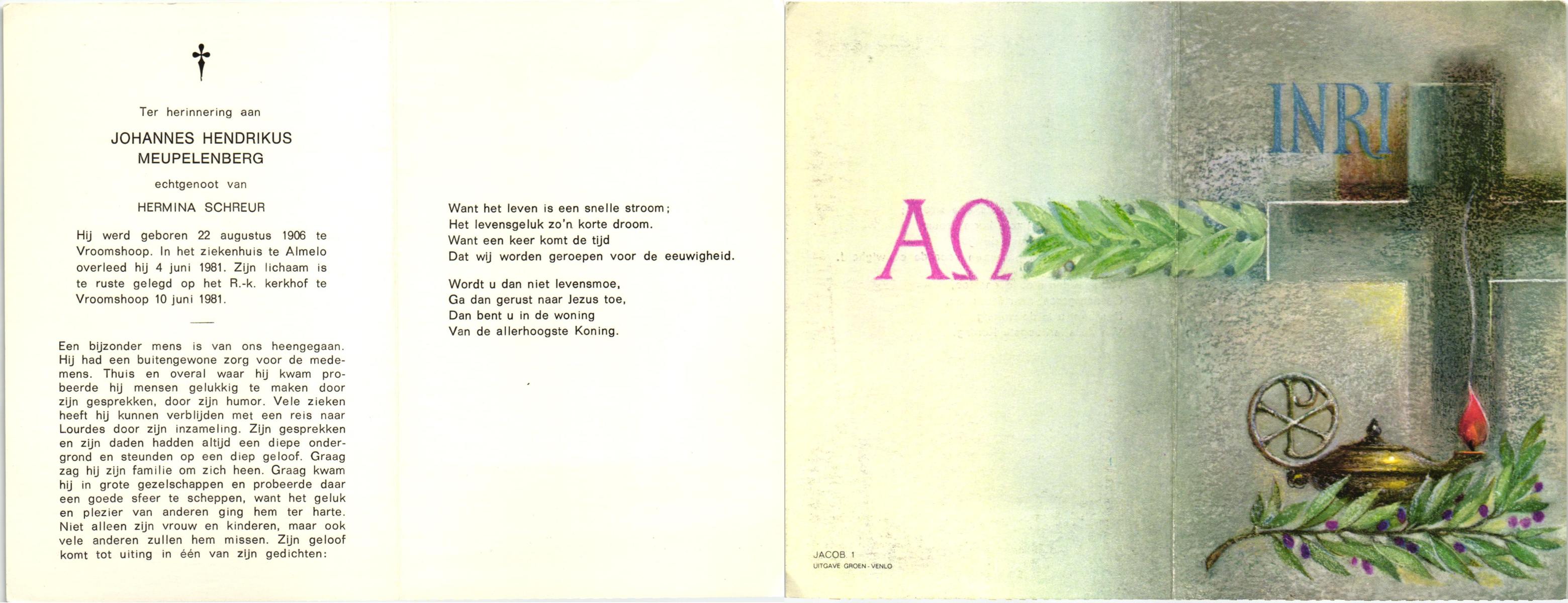 MEUPELENBERG, Johannes Hendrikus, geboren op 22-8-1906 te Vroomshoop, overleden op 4-6-1981 te Almelo op 74-jarige leeftijd, begraven op 10-6-1981 te Vroomhoop.