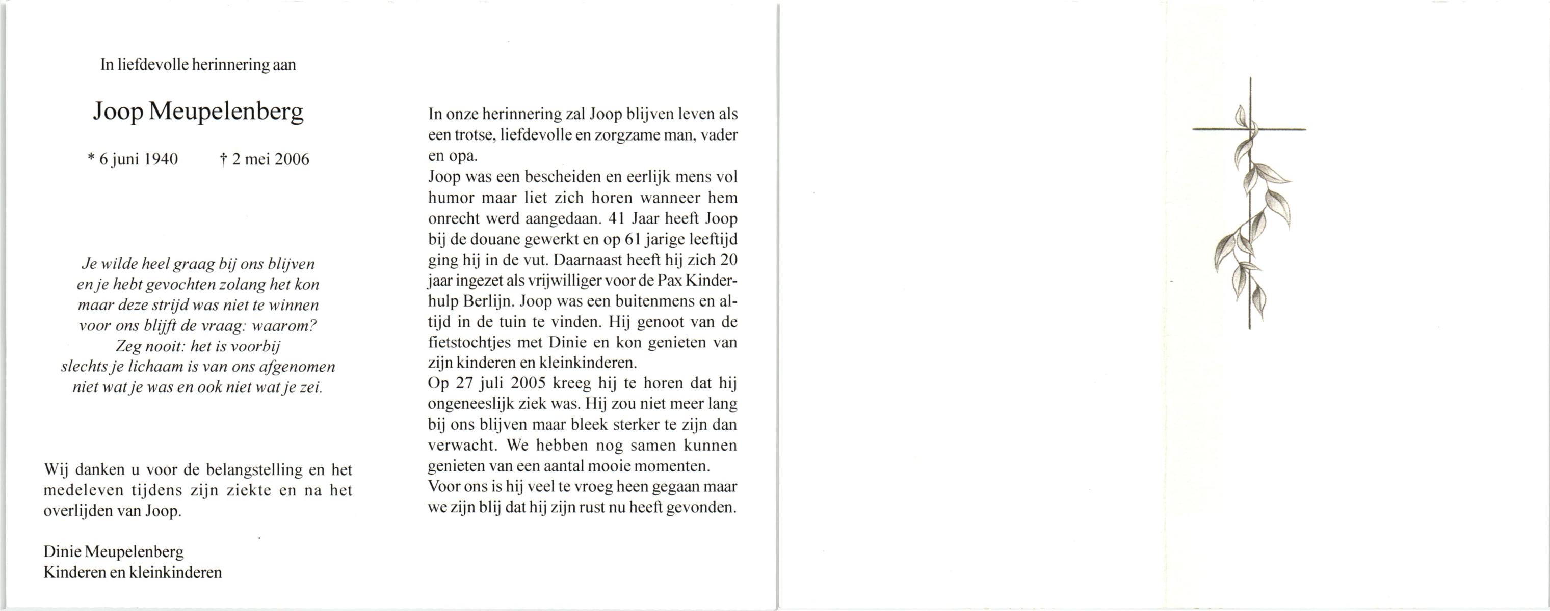 MEUPELENBERG, Joop, geboren op 6-6-1940, overleden op 2-5-2006 op 65-jarige leeftijd.