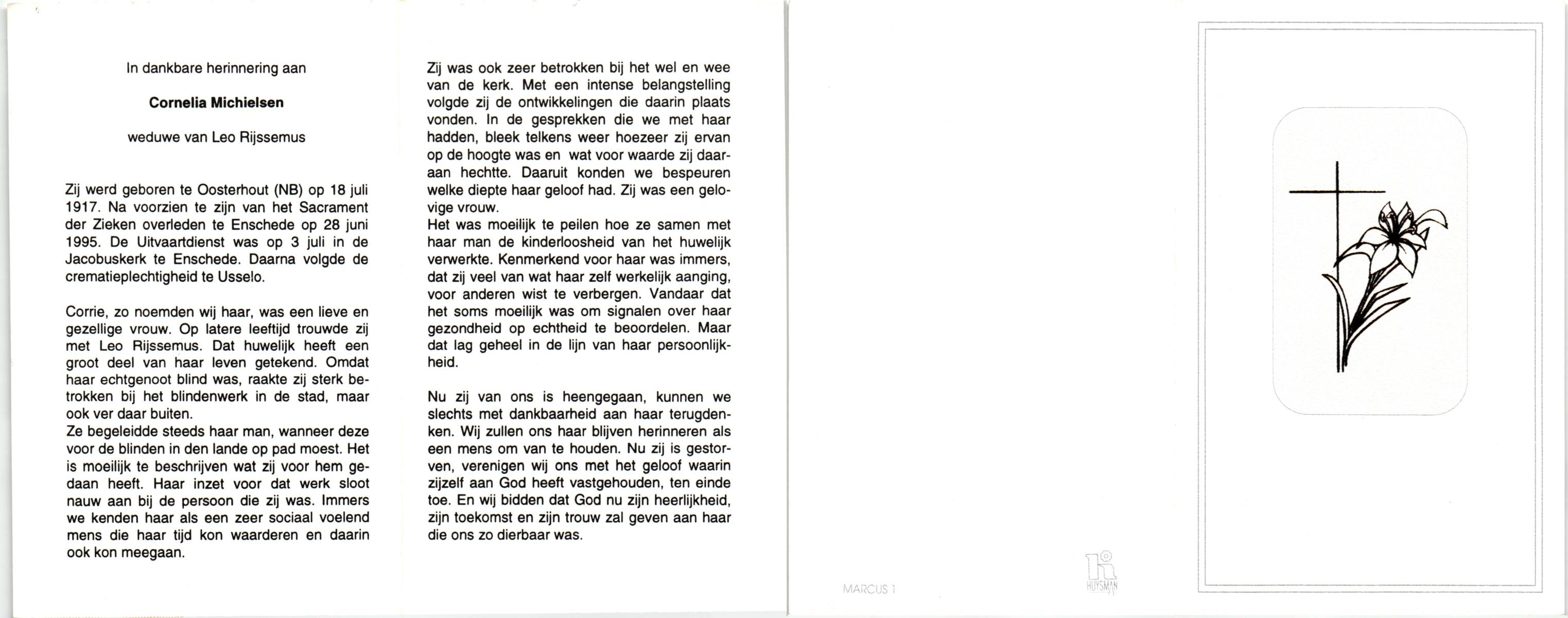 MICHIELSEN, Cornelia, geboren op 18-7-1917 te Oosterhout, N.Br., overleden op 28-6-1995 te Enschede op 77-jarige leeftijd, gecremeerd op 3-7-1995 te Usselo.