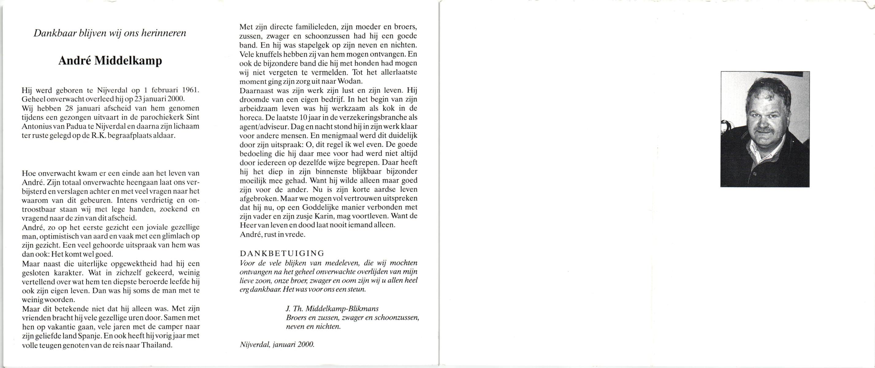 MIDDELKAMP, André, geboren op 1-2-1961 te Hellendoorn, Nijverdal, overleden op 23-1-2000 op 38-jarige leeftijd, begraven op 28-1-2000 te Hellendoorn, Nijverdal, rk.