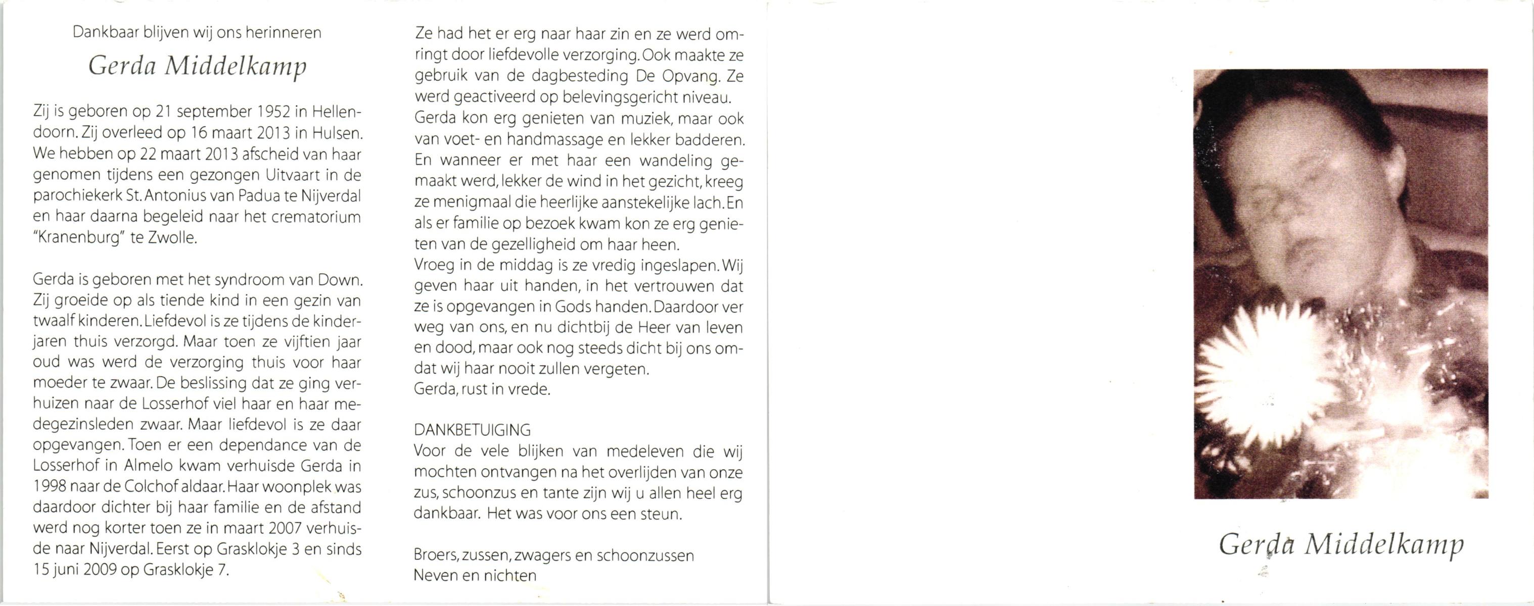 MIDDELKAMP, Gerda, geboren op 21-9-1952 te Hellendoorn, overleden op 16-3-2013 te Hellendoorn, Hulsen op 60-jarige leeftijd, gecremeerd op 22-3-2013 te Zwolle.