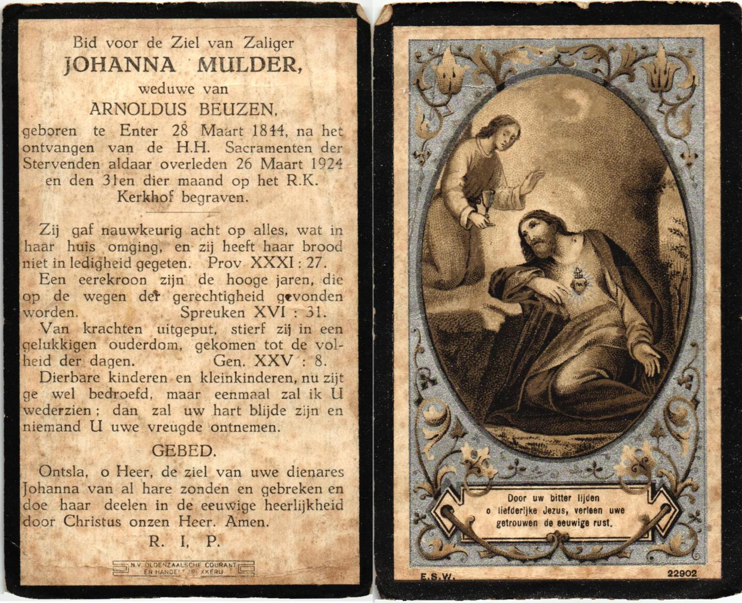 MULDER, Johanna, geboren op 28-03-1844 te Wierden, Enter, overleden op 26-3-1924 te Wierden, Enter op 79-jarige leeftijd, begraven op 31-3-1924 te Wierden, Enter.