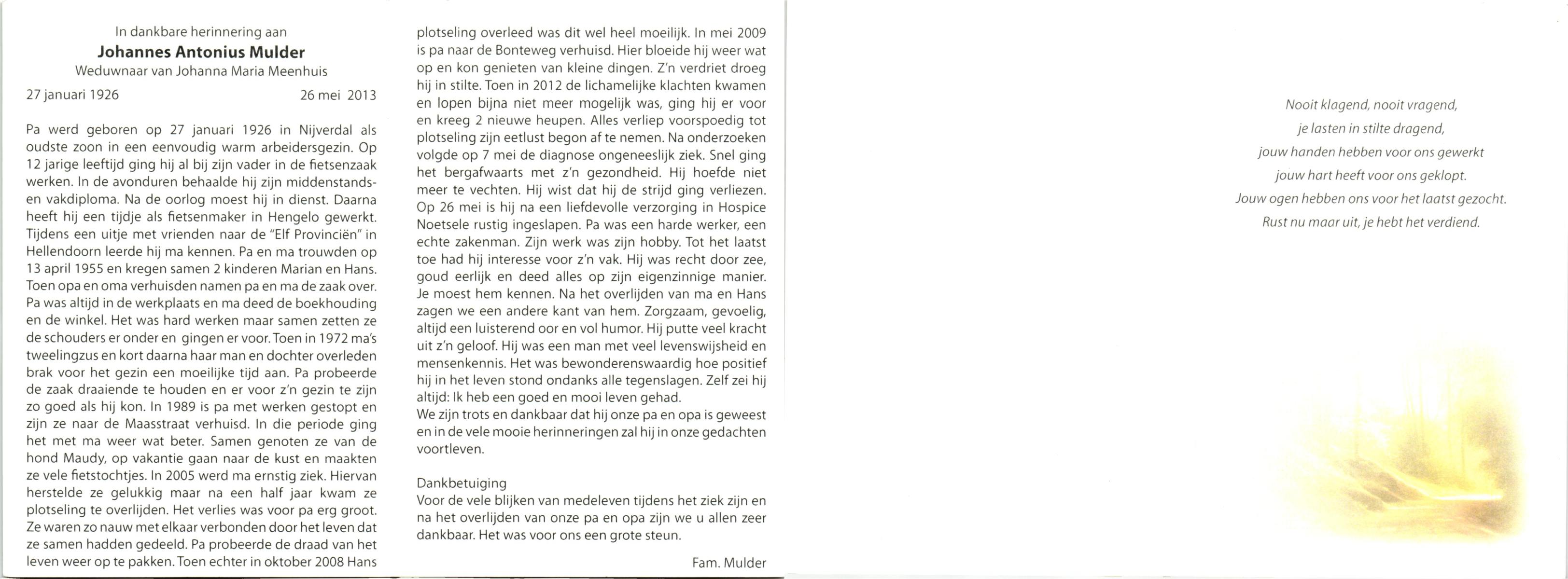 MULDER, Johannes Antonius, geboren op 27-1-1926 te Hellendoorn, Nijverdal, overleden op 26-5-2013 te Hellendoorn op 87-jarige leeftijd.