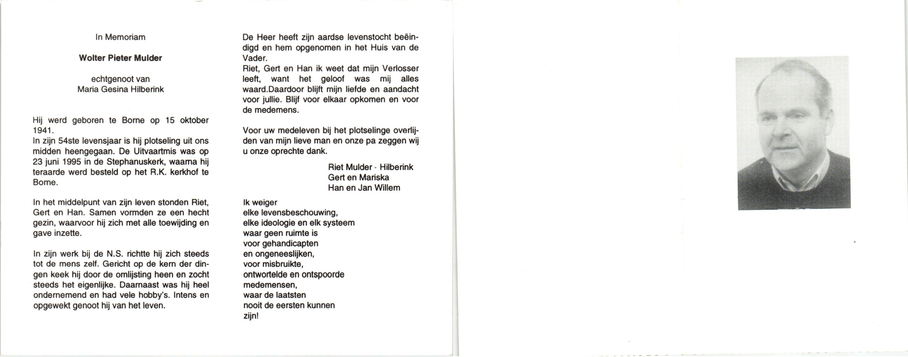 MULDER, Wolter Pieter, geboren op 15-10-1941 te Borne, overleden te Borne op 53-jarige leeftijd, begraven op 23-6-1995 te Borne.
