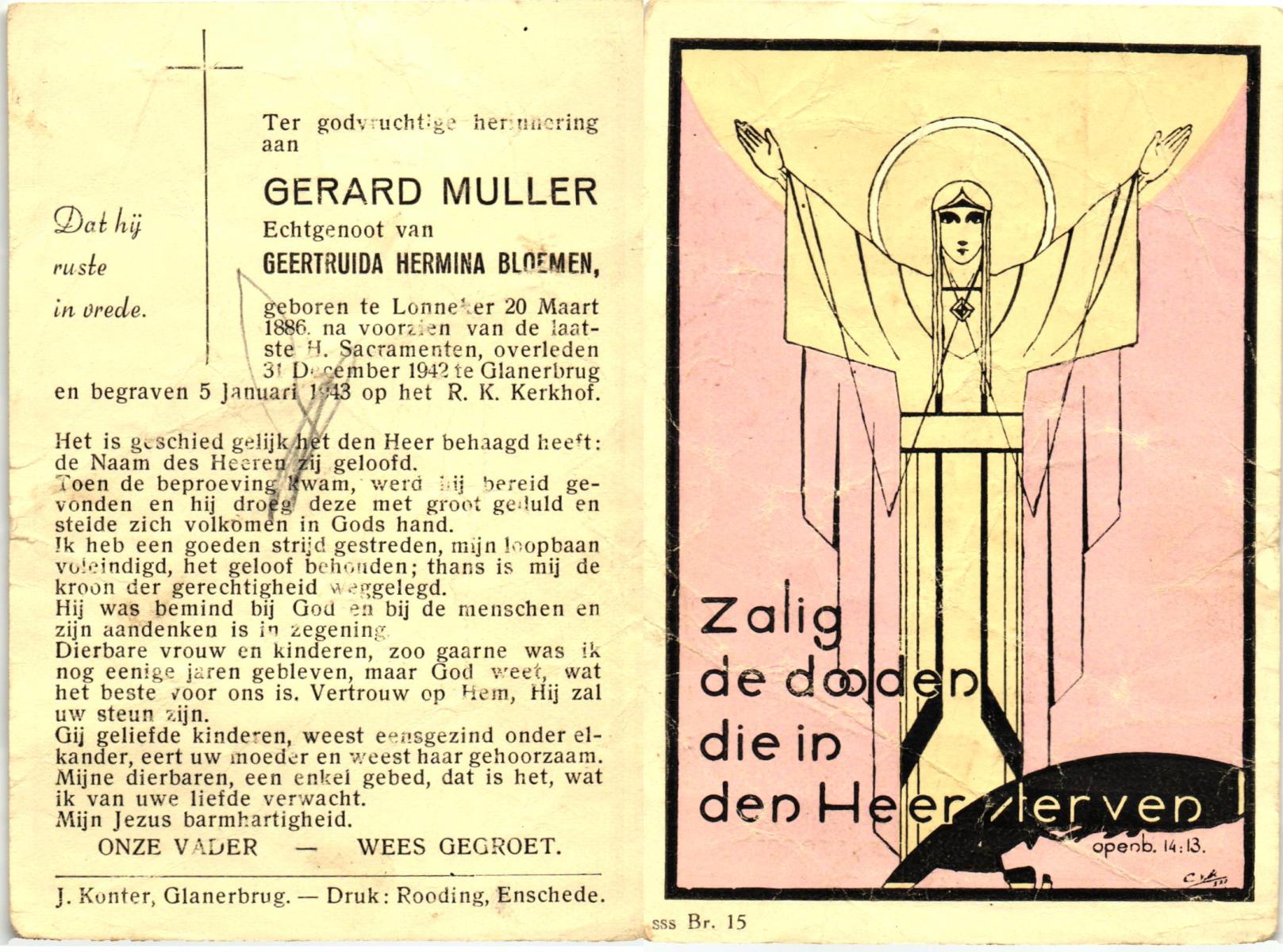 MULLER, Gerard, geboren op 20-03-1886 te Lonneker, overleden op 31-12-1942 te Glanerbrug op 56-jarige leeftijd, begraven op 5-1-1943 te Glanerbrug.