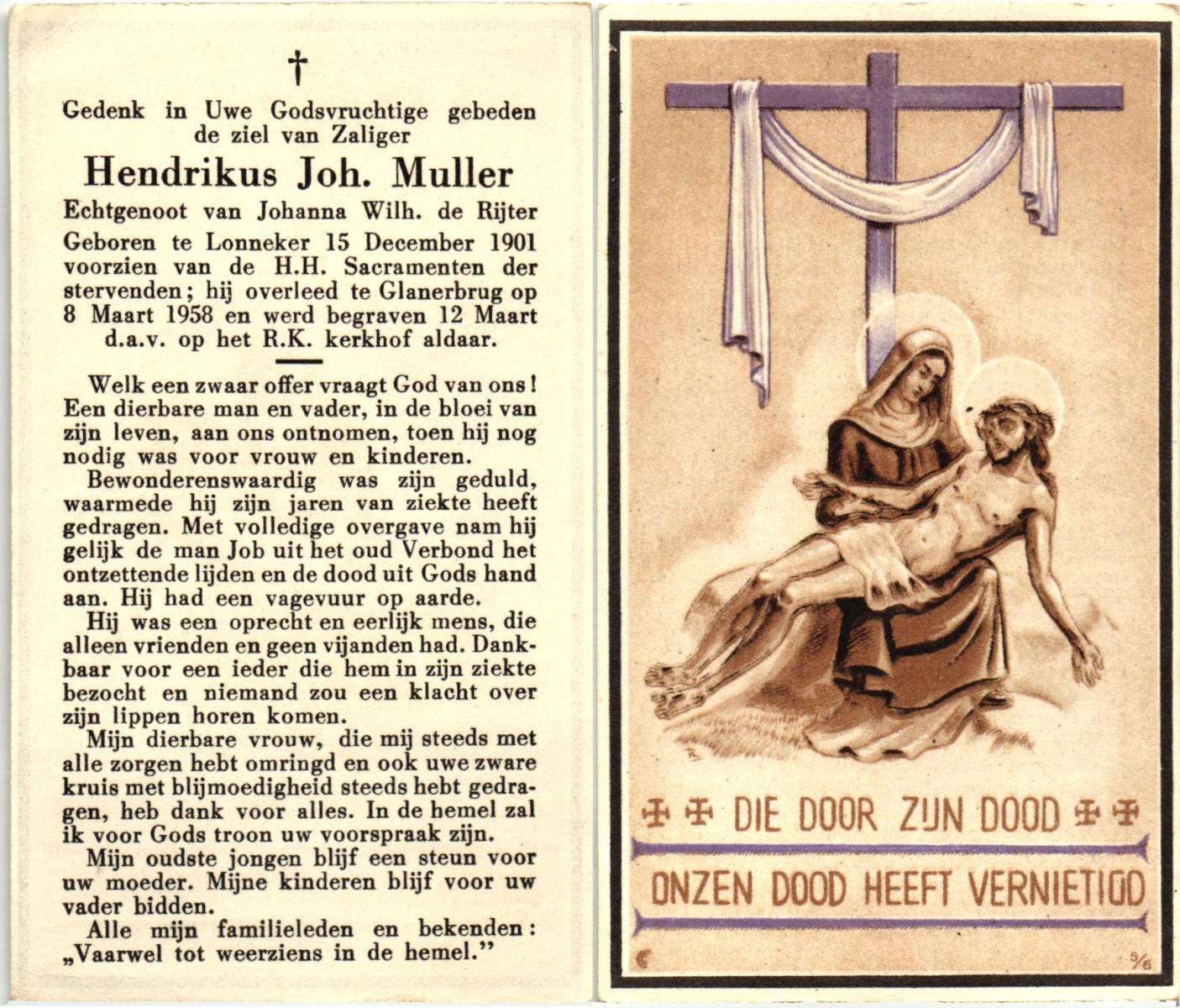 MULLER, Hendrikus Joh., geboren op 15-12-1901 te Lonneker, overleden op 8-3-1958 te Glanerbrug op 56-jarige leeftijd, begraven op 12-3-1958 te Glanerbrug.