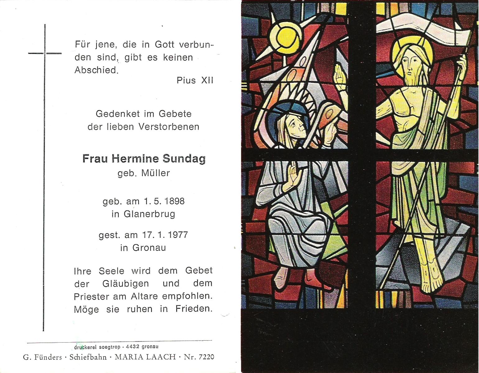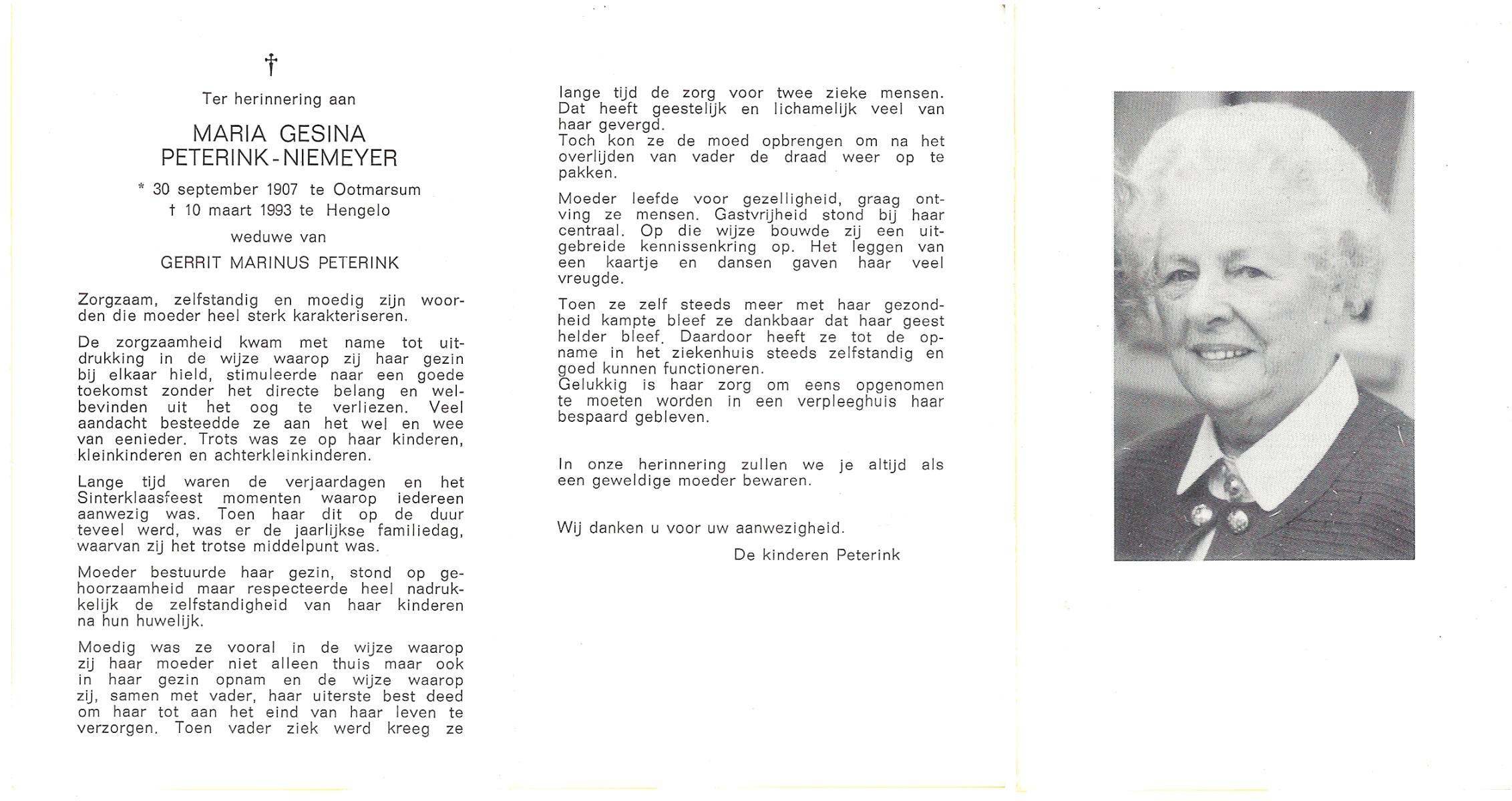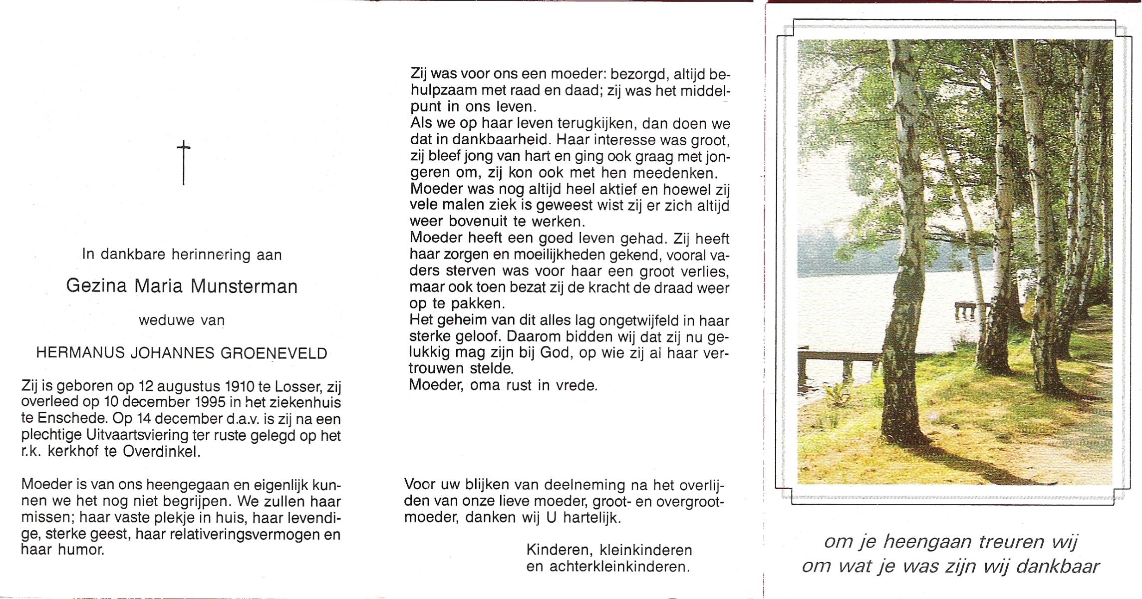 MUNSTERMAN, Gezina Maria, geboren op 12-8-1910 te Losser, overleden op 10-12-1995 te Enschede op 85-jarige leeftijd, begraven op 14-12-1995 te Overdinkel.