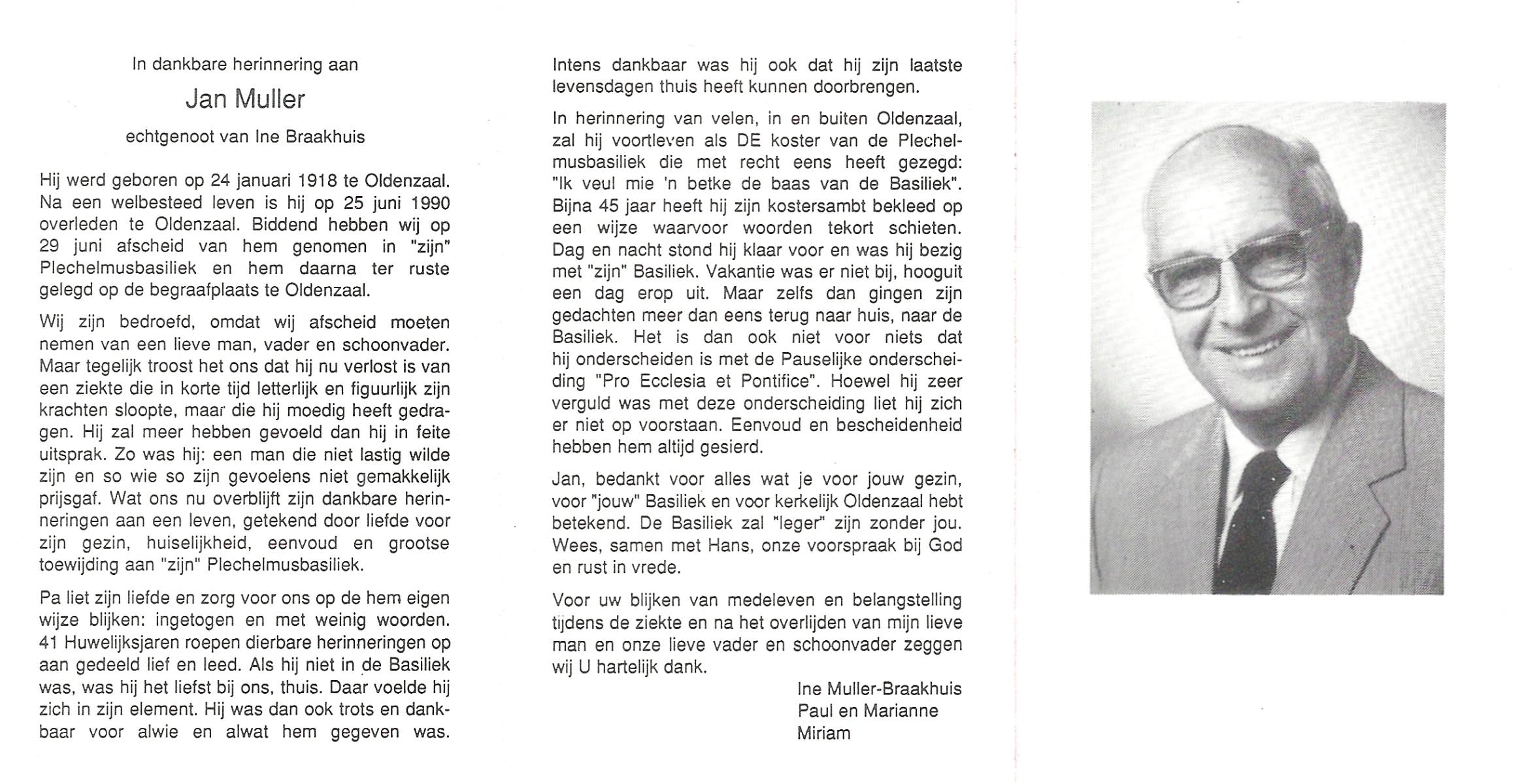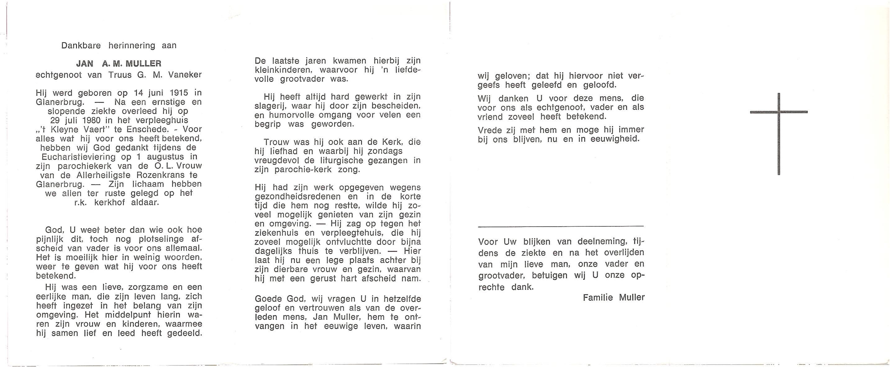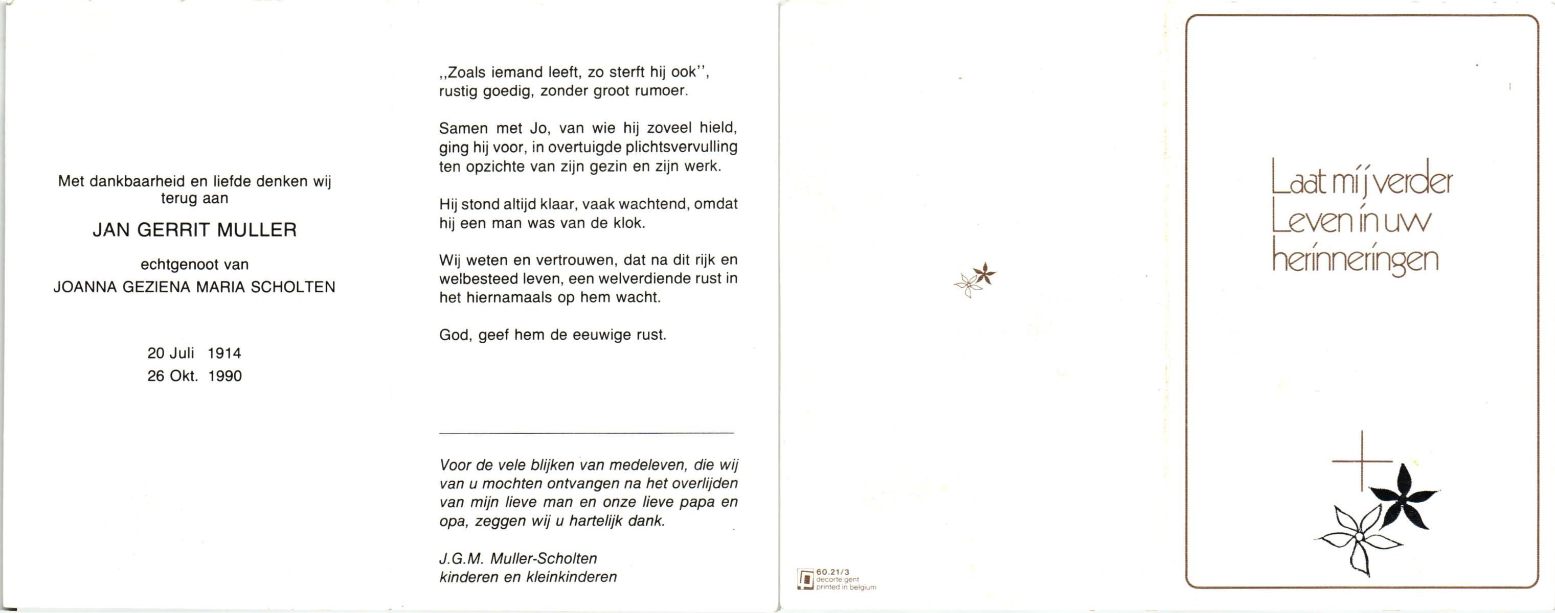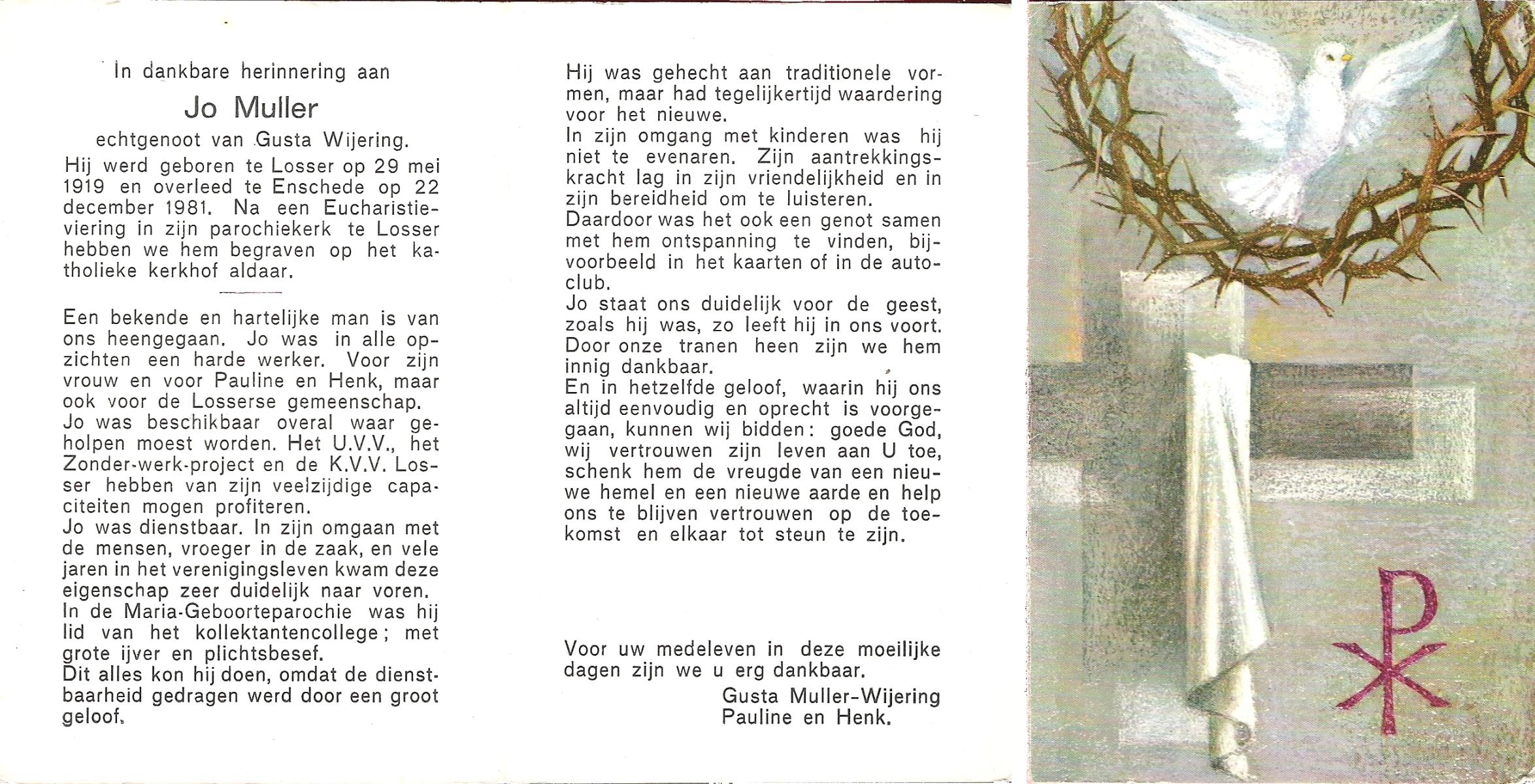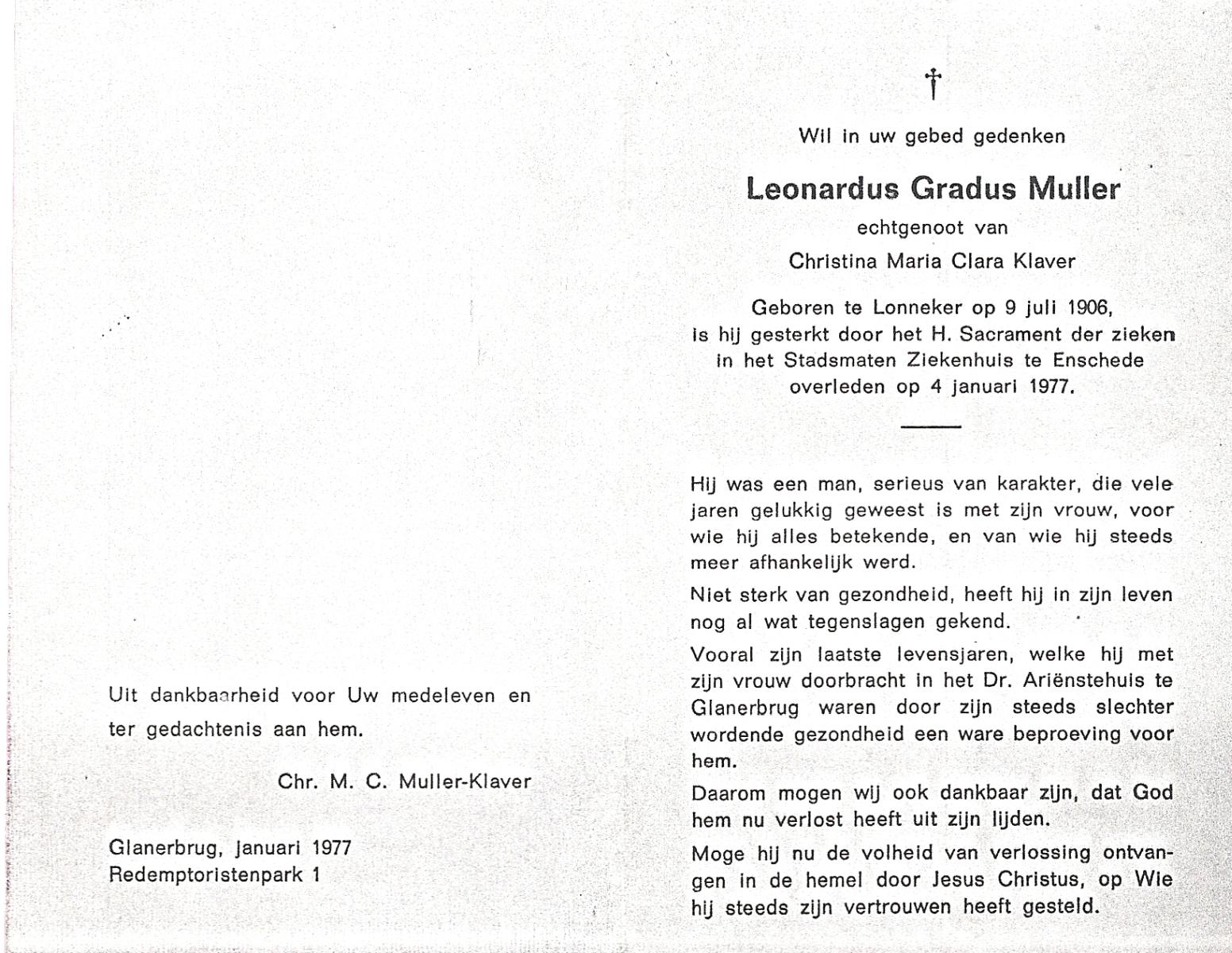 MULLER, Leonardus Gradus, geboren op 9-7-1906 te Lonneker, overleden op 4-1-1977 te Enschede op 70-jarige leeftijd.