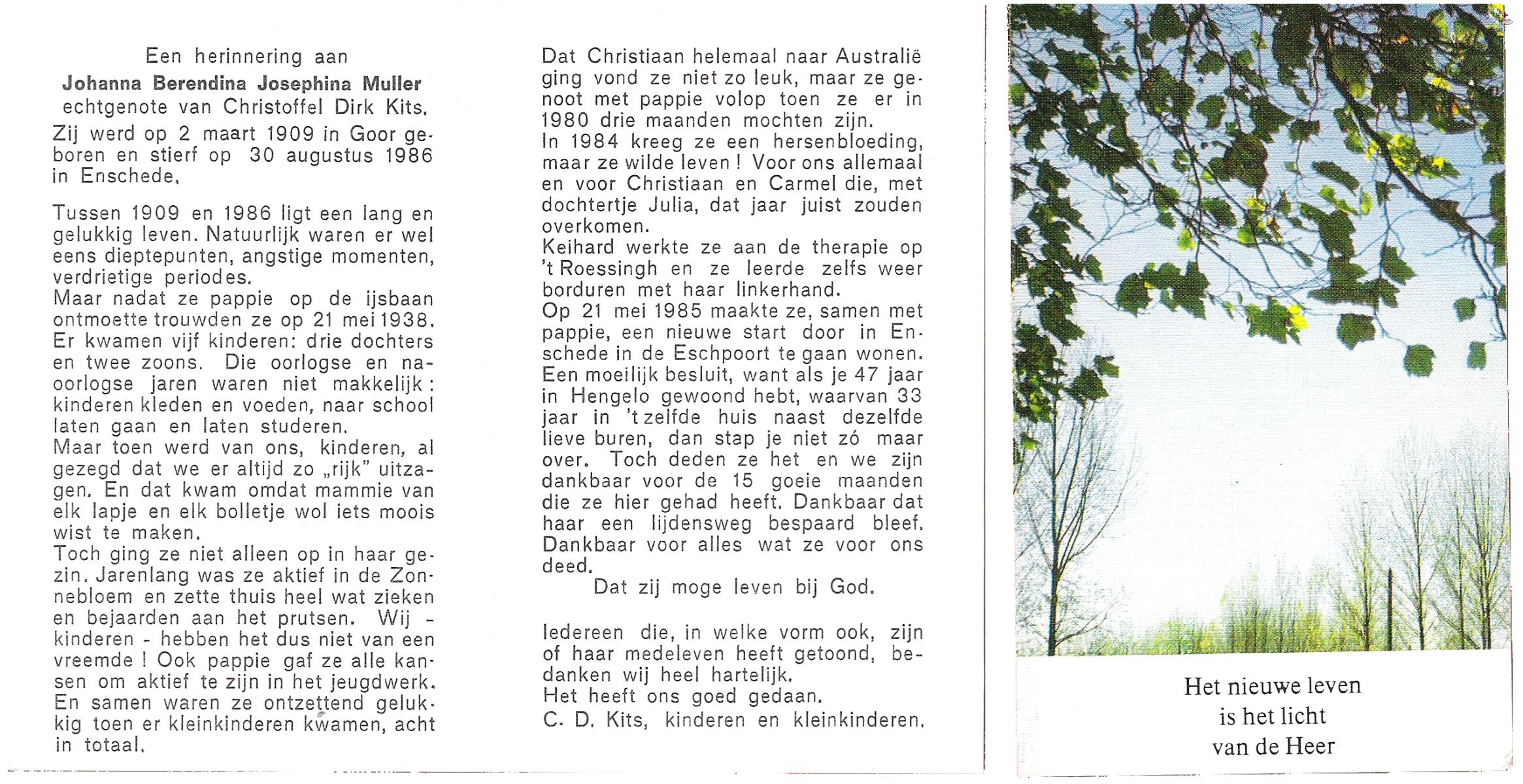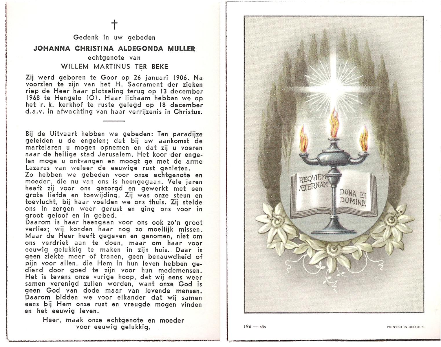 MULLER, Johanna Christina Aldegonda, geboren op 26-1-1906 te Goor, overleden op 13-12-1968 te Hengelo (Ov.) op 62-jarige leeftijd, begraven op 18-12-1968 te Hengelo (Ov.).
