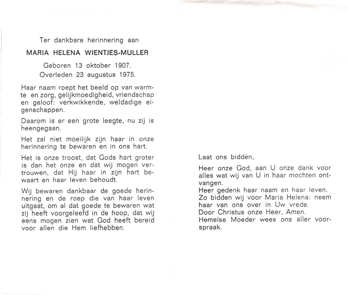 MULLER, Maria Helena, geboren op 13-10-1907, overleden op 23-8-1975 op 67-jarige leeftijd.