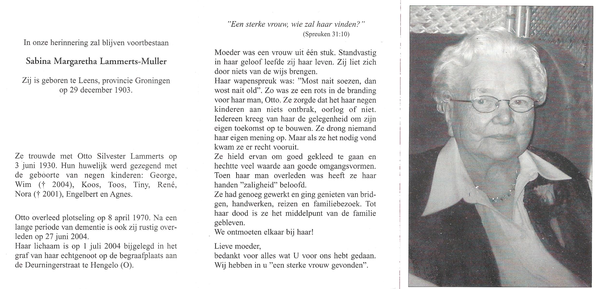 MULLER, Sabina Margaretha, geboren op 29-12-1903 te Leens, Gr, overleden op 27-6-2004 te Hengelo (Ov.) op 100-jarige leeftijd, begraven op 1-7-2004 te Hengelo (Ov.).