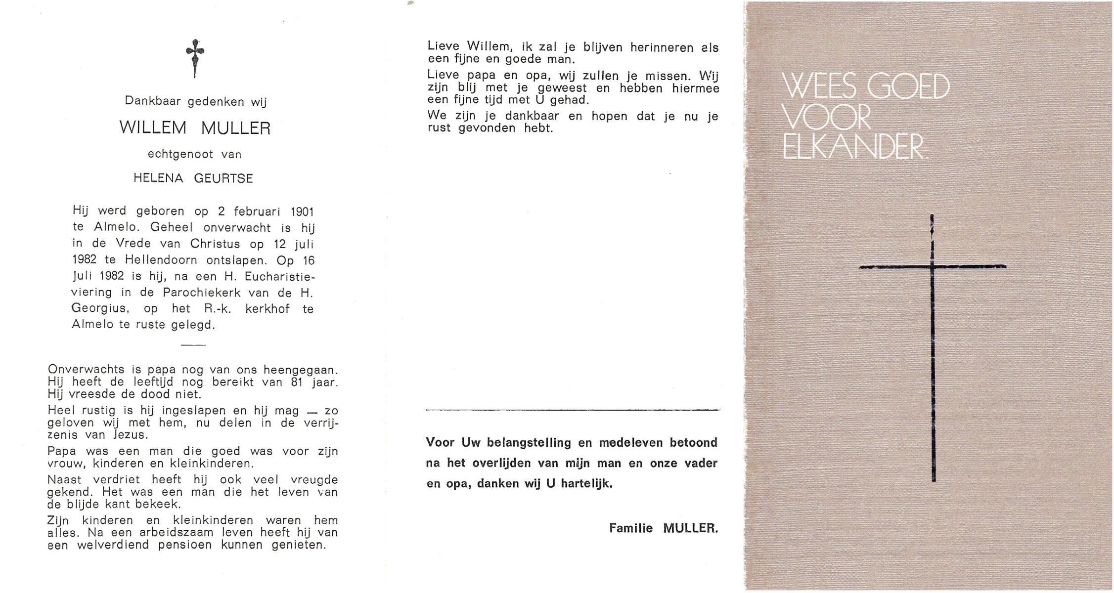 MULLER, Willem, geboren op 2-2-1901 te Almelo, overleden op 12-7-1982 te Hellendoorn op 81-jarige leeftijd, begraven op 16-7-1982 te Hellendoorn.