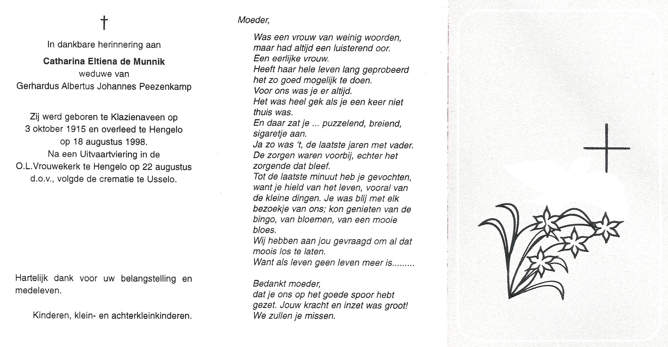 MUNNIK, de, Catharina Eltiena, geboren op 3-10-1915 te Klazienaveen, overleden op 18-8-1998 te Hengelo (Ov.) op 82-jarige leeftijd, gecremeerd op 22-8-1998 te Usselo.