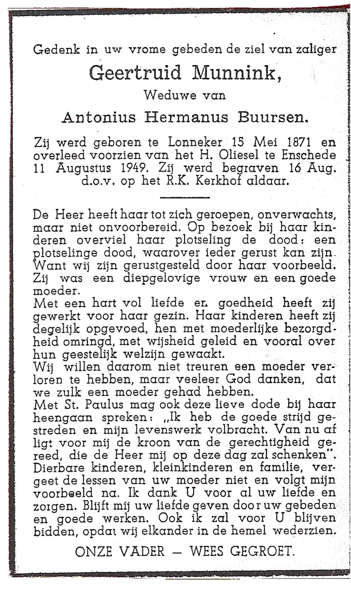 MUNNINK, Geertruid, geboren op 15-05-1871 te Lonneker, overleden op 11-8-1949 te Enschede op 78-jarige leeftijd, begraven op 16-8-1949 te Enschede.