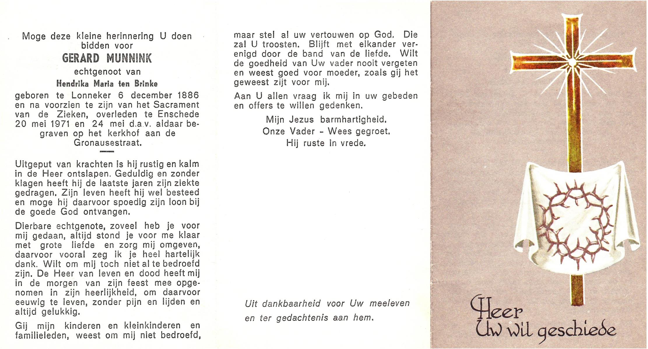 MUNNINK, Gerard, geboren op 06-12-1886 te Lonneker, overleden op 20-5-1971 te Enschede op 83-jarige leeftijd, begraven op 24-5-1971 te Enschede.