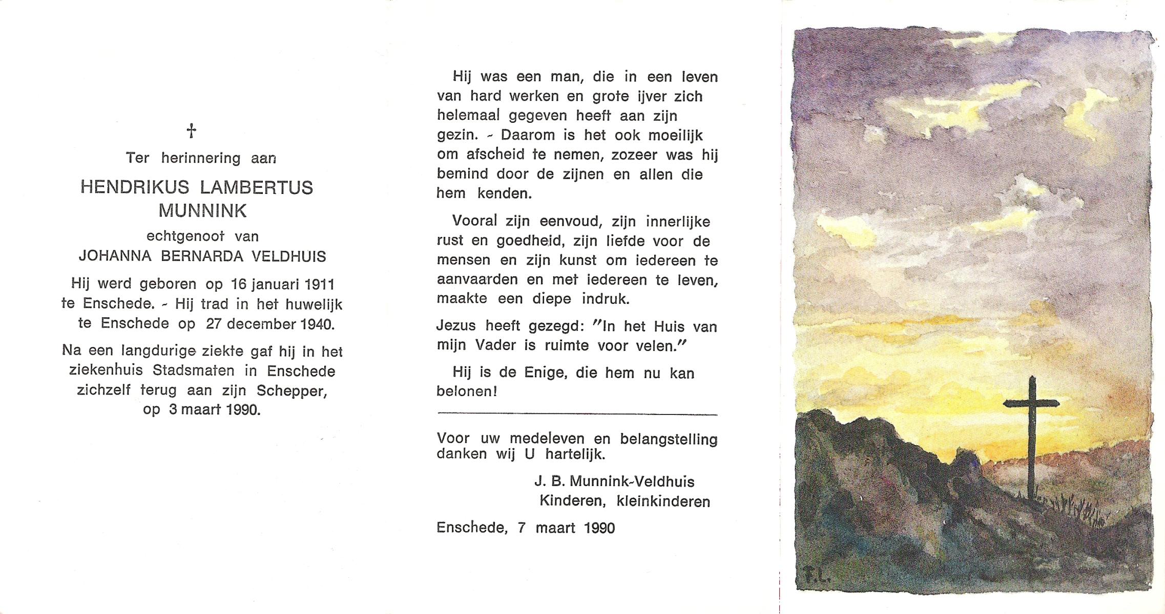 MUNNINK, Hendrikus Lambertus, geboren op 16-1-1911 te Enschede, overleden op 3-3-1990 te Enschede op 79-jarige leeftijd.