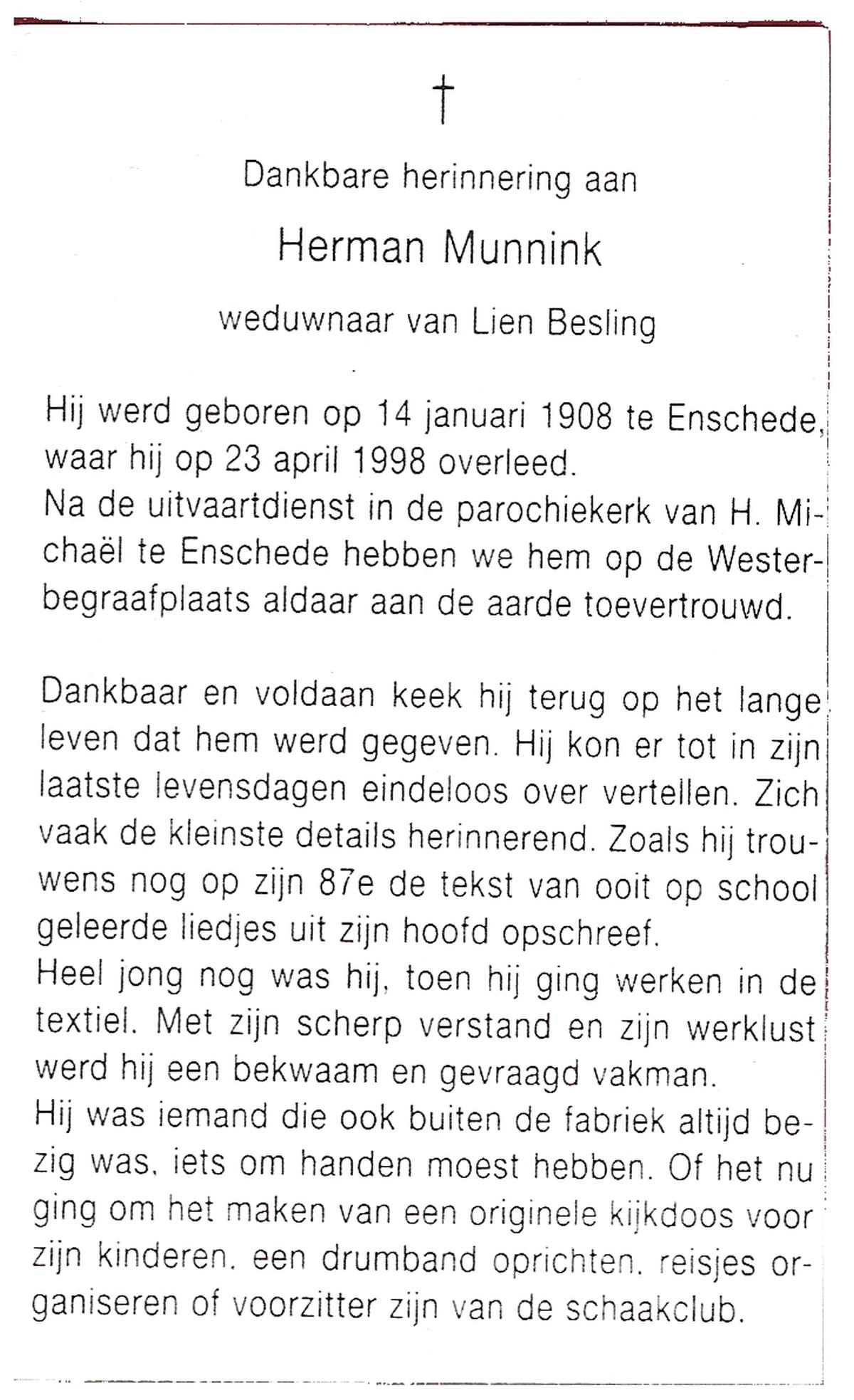 MUNNINK, Herman, geboren op 14-1-1908 te Enschede, overleden op 23-4-1998 te Enschede op 90-jarige leeftijd, begraven te Enschede.