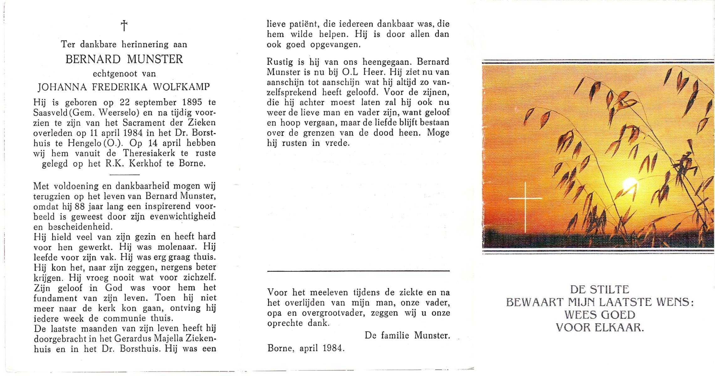 MUNSTER, Bernard, geboren op 22-09-1895 te Saasveld, overleden op 11-4-1984 te Hengelo (Ov.) op 88-jarige leeftijd, begraven op 14-4-1984 te Borne.