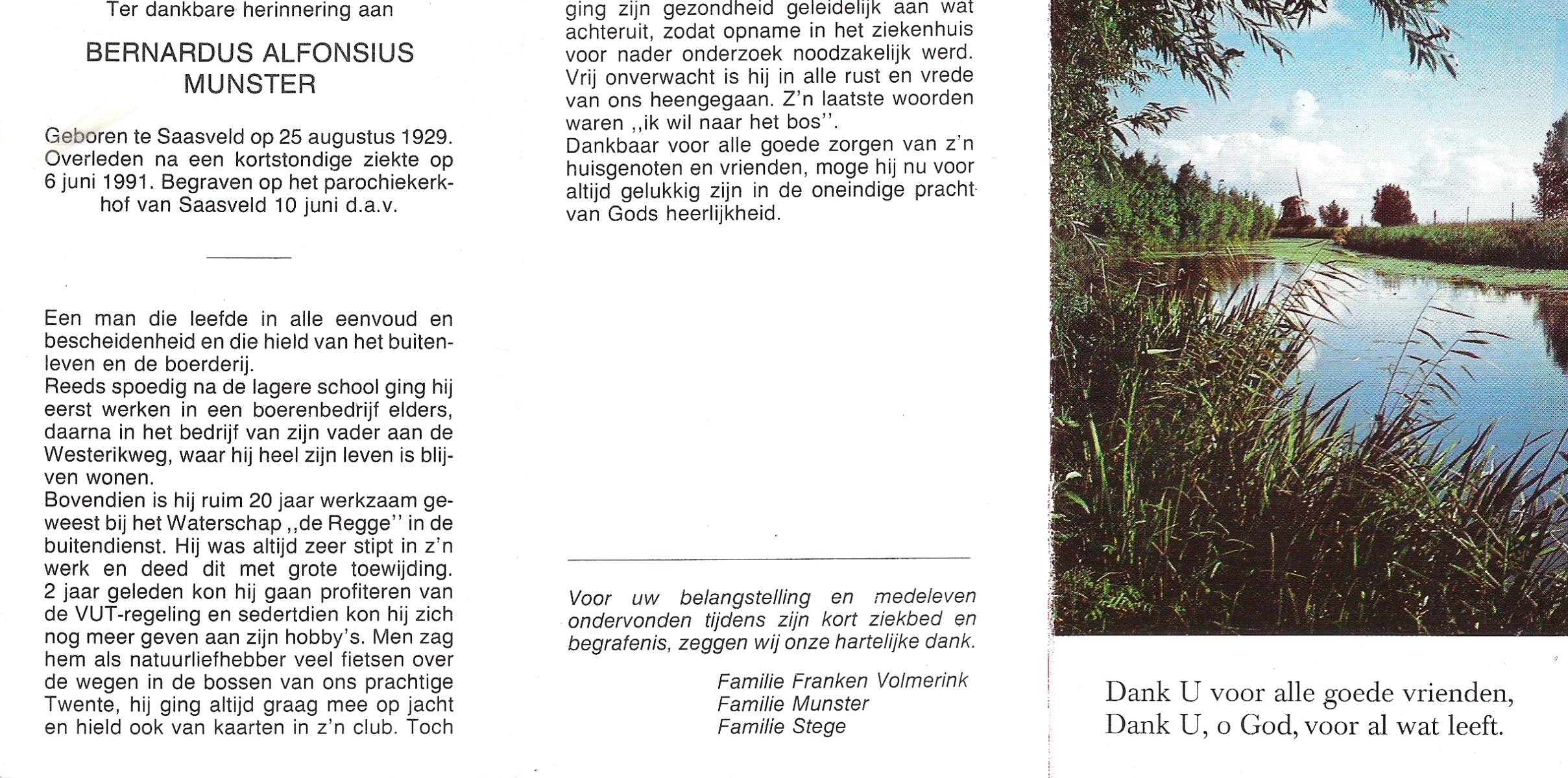 MUNSTER, Bernardus Alfonsius, geboren op 25-8-1929 te Saasveld, overleden op 6-6-1991 op 61-jarige leeftijd, begraven op 10-6-1991 te Saasveld.