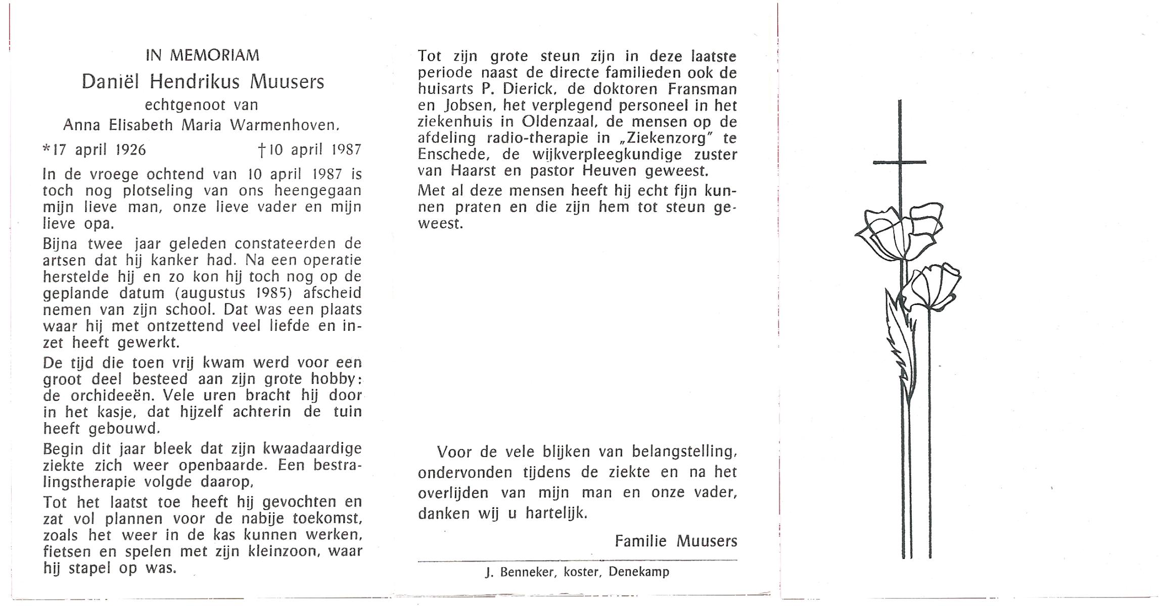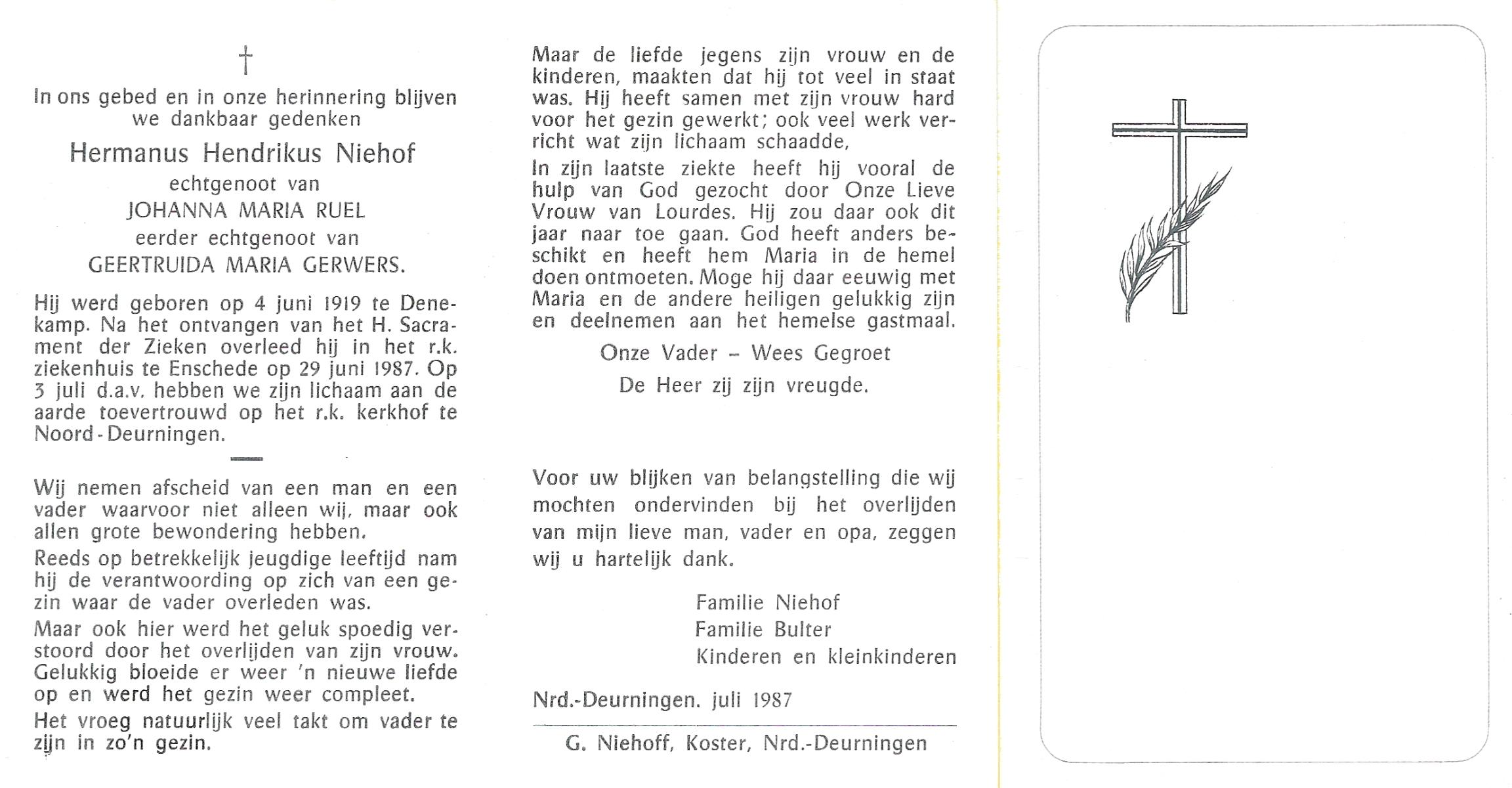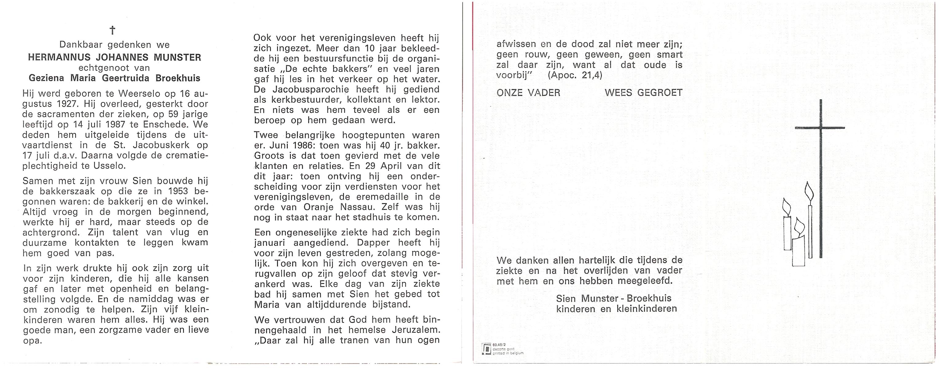 MUNSTER, Hermannus Johannes, geboren op 16-8-1927 te Weerselo, overleden op 14-7-1987 te Enschede op 59-jarige leeftijd, gecremeerd op 17-7-1987 te Usselo.