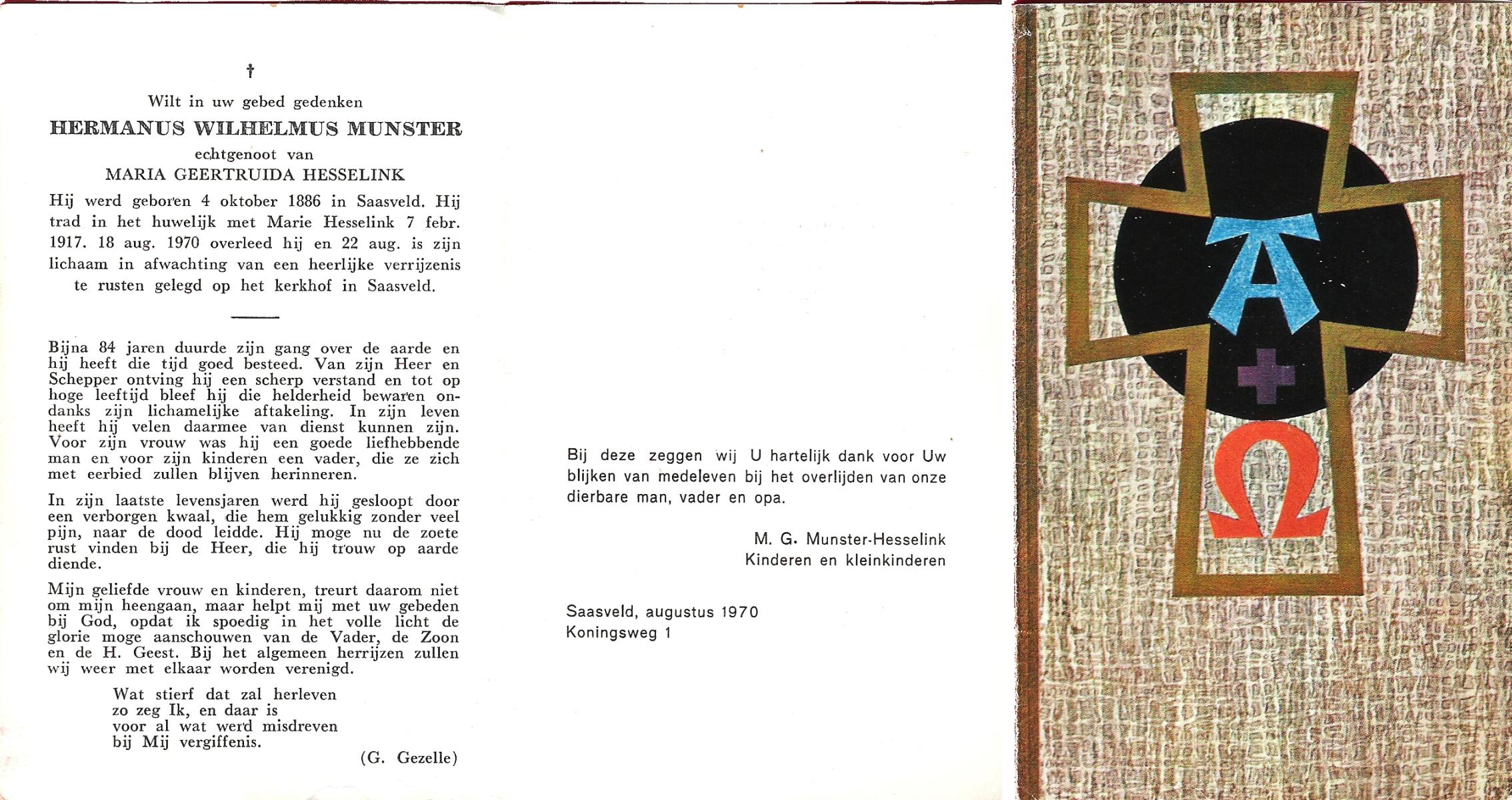 MUNSTER, Hermanus Wilhelmus, geboren op 04-10-1886 te Saasveld, overleden op 18-8-1970 op 83-jarige leeftijd, begraven op 22-8-1970 te Saasveld.